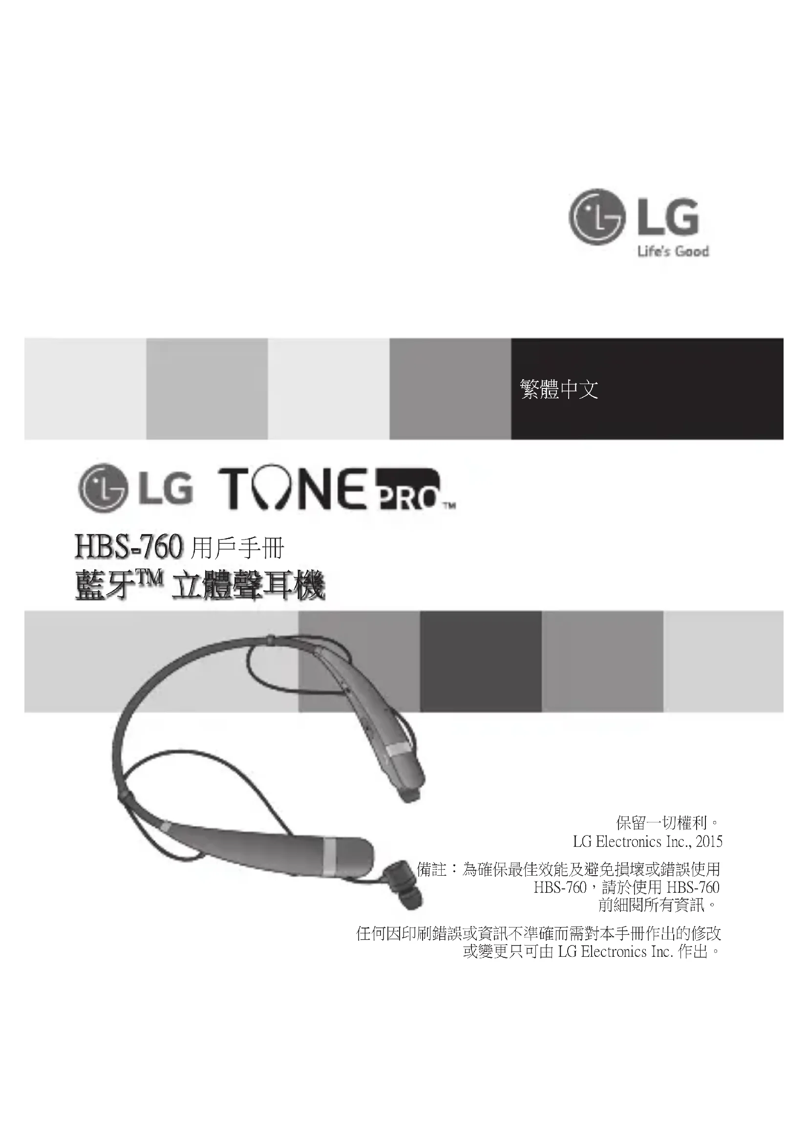 任何因印刷錯誤或資訊不準確而需對本手冊作出的修改 或變更只可由 LG Electronics Inc. 作出。 HBS-760 用戶手冊