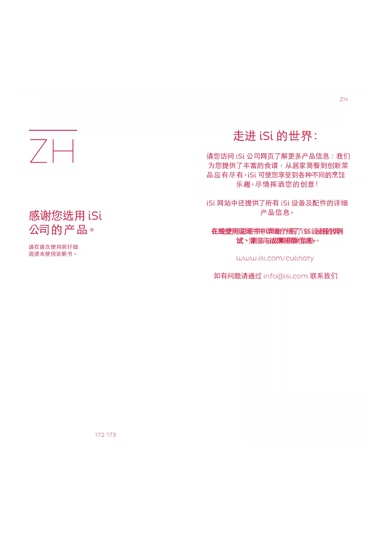 在线使用说明书中详细介绍了 iSi 设备的调 试、清洁与故障排除信息。 www.isi.com/culinary 如有问题请通过 info@isi.com 联系我们174 175