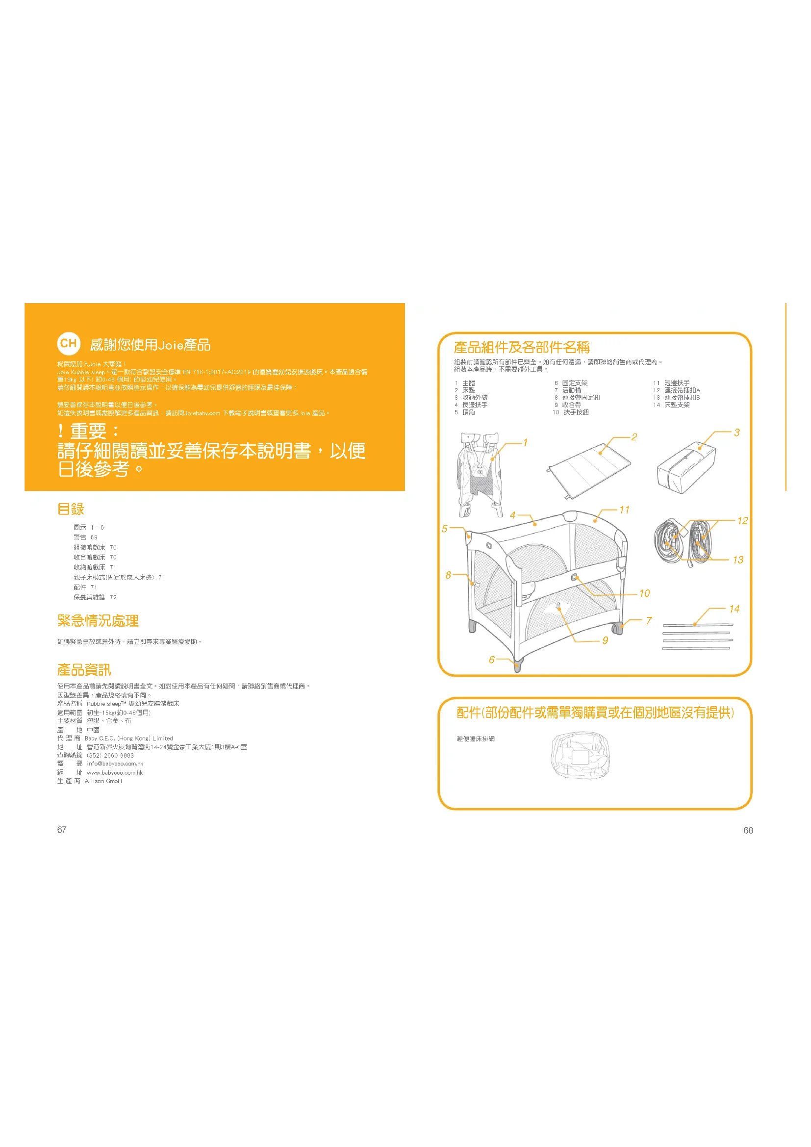 感謝您使用Joie產品 祝賀您加入Joie 大家庭!Joie Kubbie sleep 是一款符合歐盟安全標準 EN 716-1:2017+AC:2019 的優質嬰幼兒安撫游戲床。本產品適合體重15kg 以下( 約0-48 個月) 的嬰幼兒使用。請仔細閱讀本說明書並依照指示操作,以確保能為嬰幼兒提供舒適的睡眠及最佳保障。請妥善保存本說明書以便日後參考。如遺失說明書或需瞭解更多產品資訊,請訪問Joiebaby.com 下載電子說明書或查看更多Joie 產品。