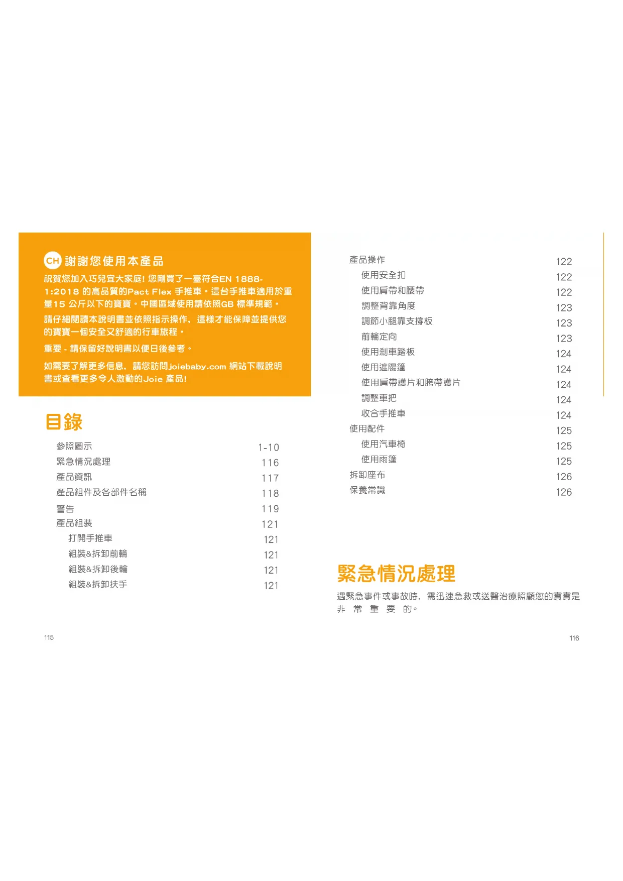 祝賀您加入巧兒宜大家庭! 您剛買了一臺符合EN 1888-1:2018 的高品質的Pact Flex 手推車。這台手推車適用於重量15 公斤以下的寶寶。中國區域使用請依照GB 標準規範。請仔細閱讀本說明書並依照指示操作﹐這樣才能保障並提供您的寶寶一個安全又舒適的行車旅程。