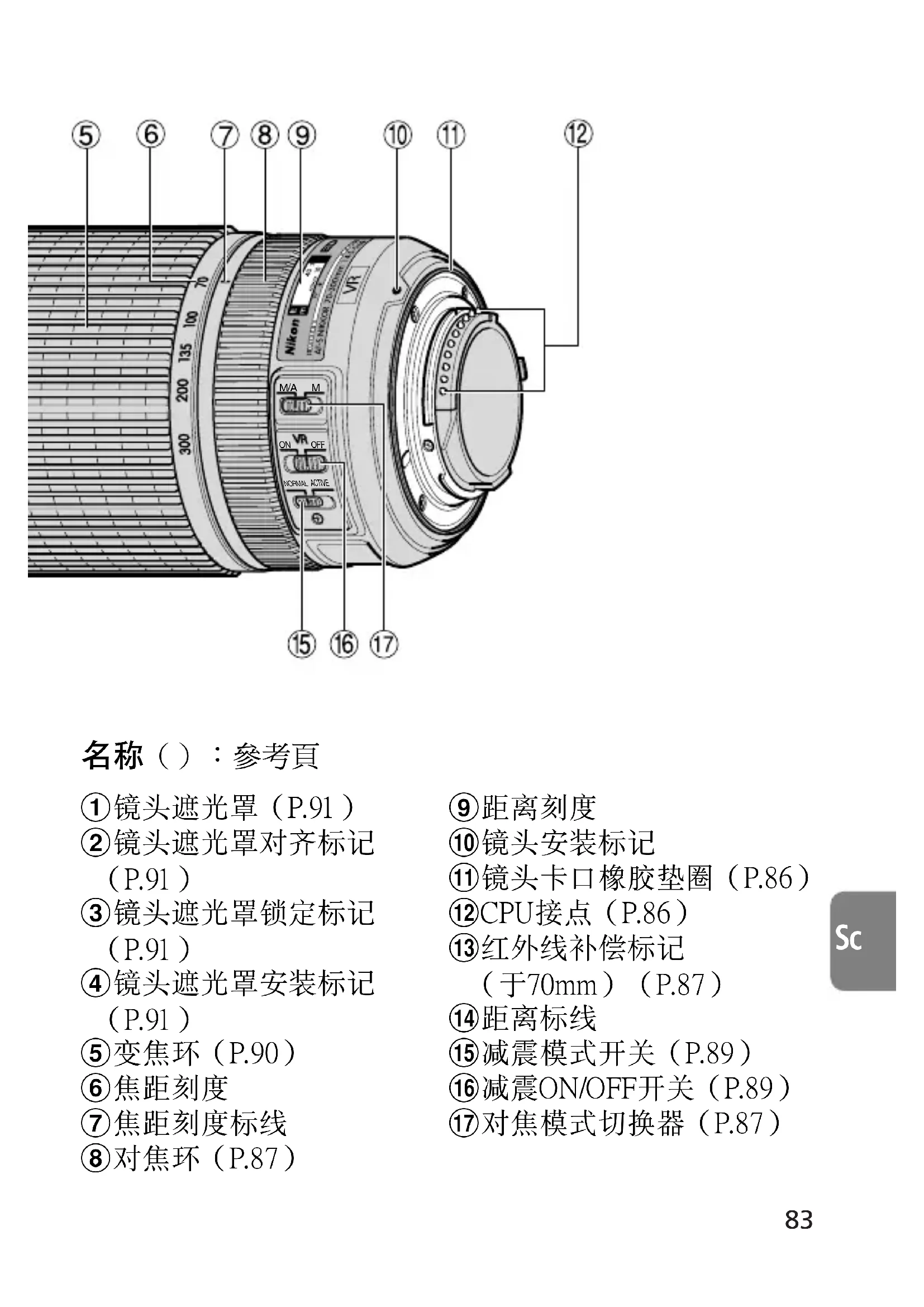 1鏡頭遮光罩(P.91) 2鏡頭遮光罩對齊標記 (P.91) 3鏡頭遮光罩鎖定標記 (P.91) 4鏡頭遮光罩安裝標記 (P.91) 5變焦環(P.90) 6焦距刻度 7焦距刻度標線 8對焦環(P.87) 9距離刻度