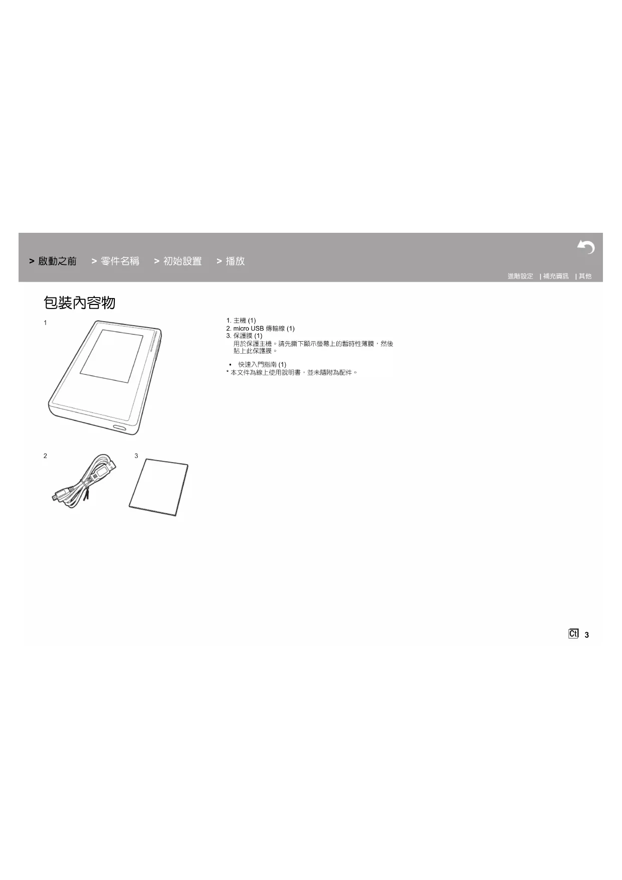 1. 主機 (1)2. micro USB 傳輸線 (1)3. 保護膜 (1)用於保護主機。請先撕下顯示螢幕上的暫時性薄膜,然後貼上此保護膜。0 快速入門指南 (1)* 本文件為線上使用說明書,並未隨附為配件。