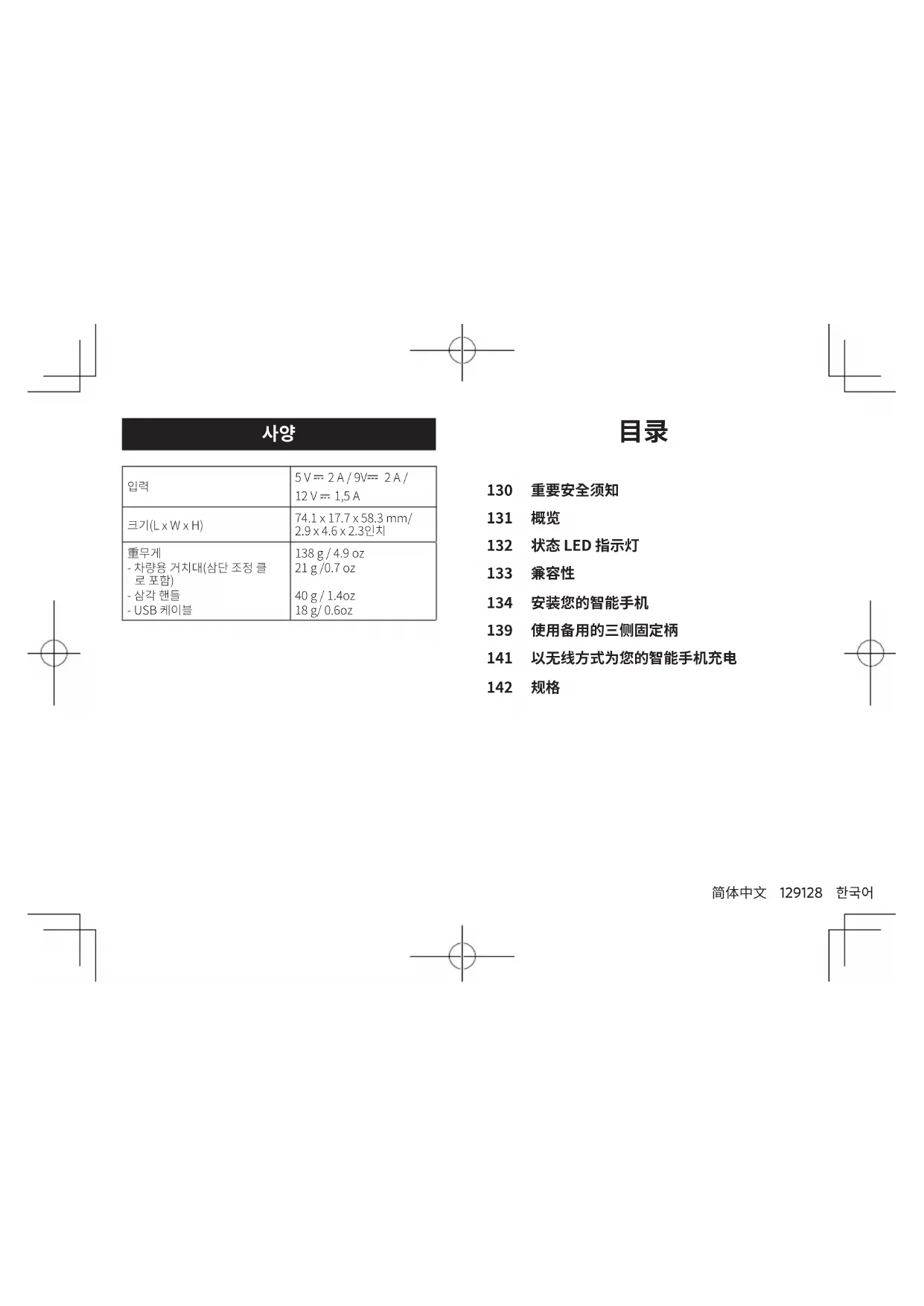 130 重要安全须知 131 概览 132 状态LED指示灯 133 兼容性 134 安装您的智能手机 139 使用备用的三侧固定柄 141 以无线方式为您的智能手机充电 142 规格130 简体中文 简体中文 131