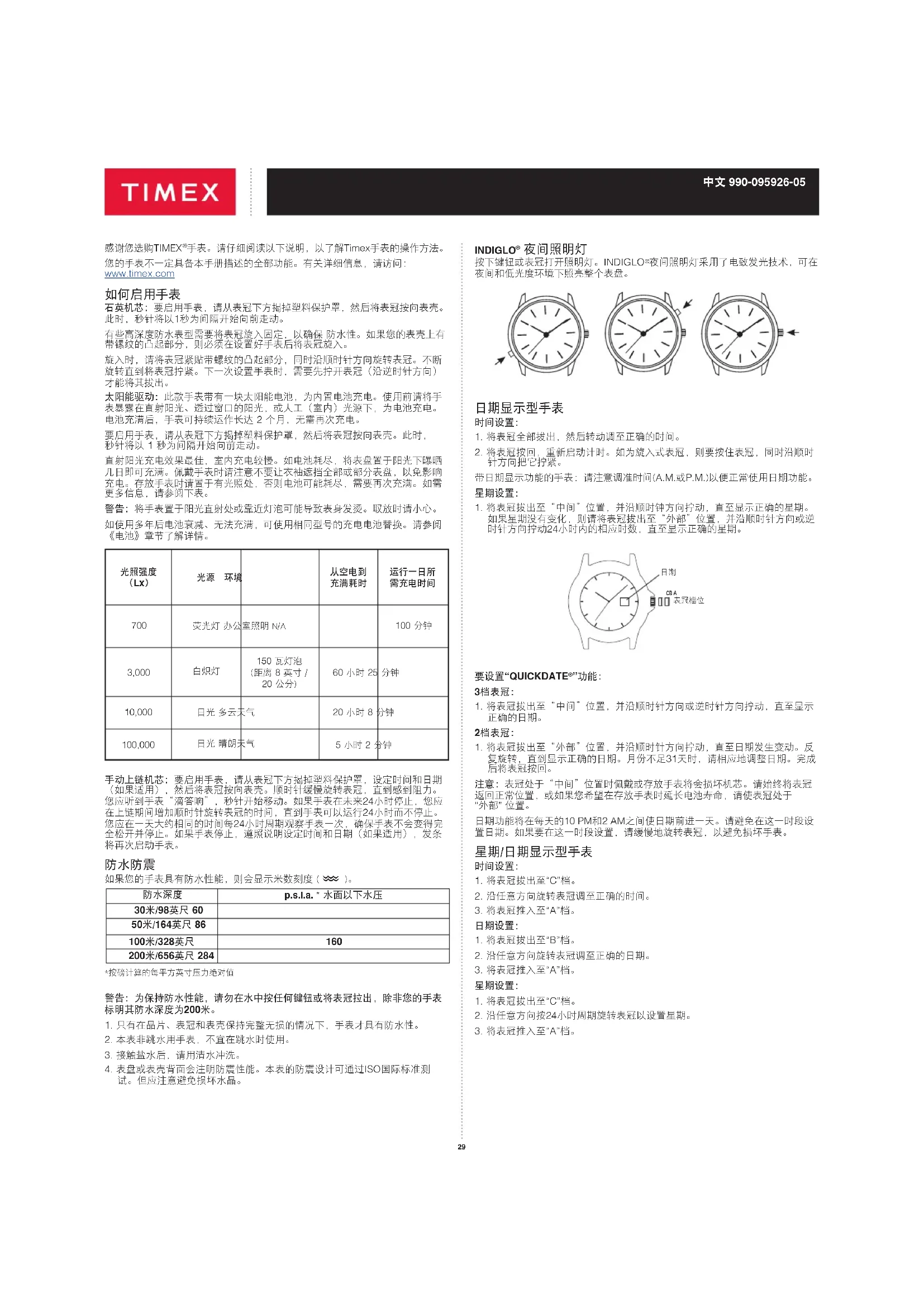 手表。请仔细阅读以下说明,以了解Timex手表的操作方法。 您的手表不一定具备本手册描述的全部功能。有关详细信息,请访问: www.timex.com