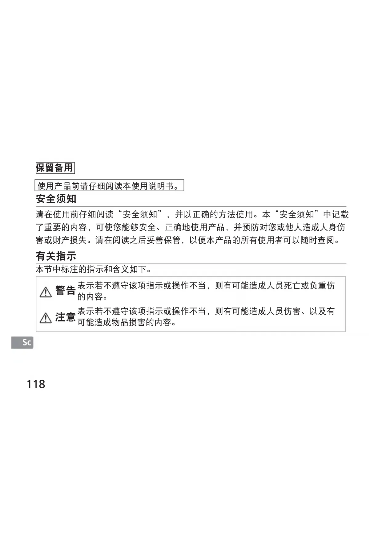 请在使用前仔细阅读“安全须知”,并以正确的方法使用。本“安全须知”中记载 了重要的内容,可使您能够安全、正确地使用产品,并预防对您或他人造成人身伤 害或财产损失。请在阅读之后妥善保管,以便本产品的所有使用者可以随时查阅。