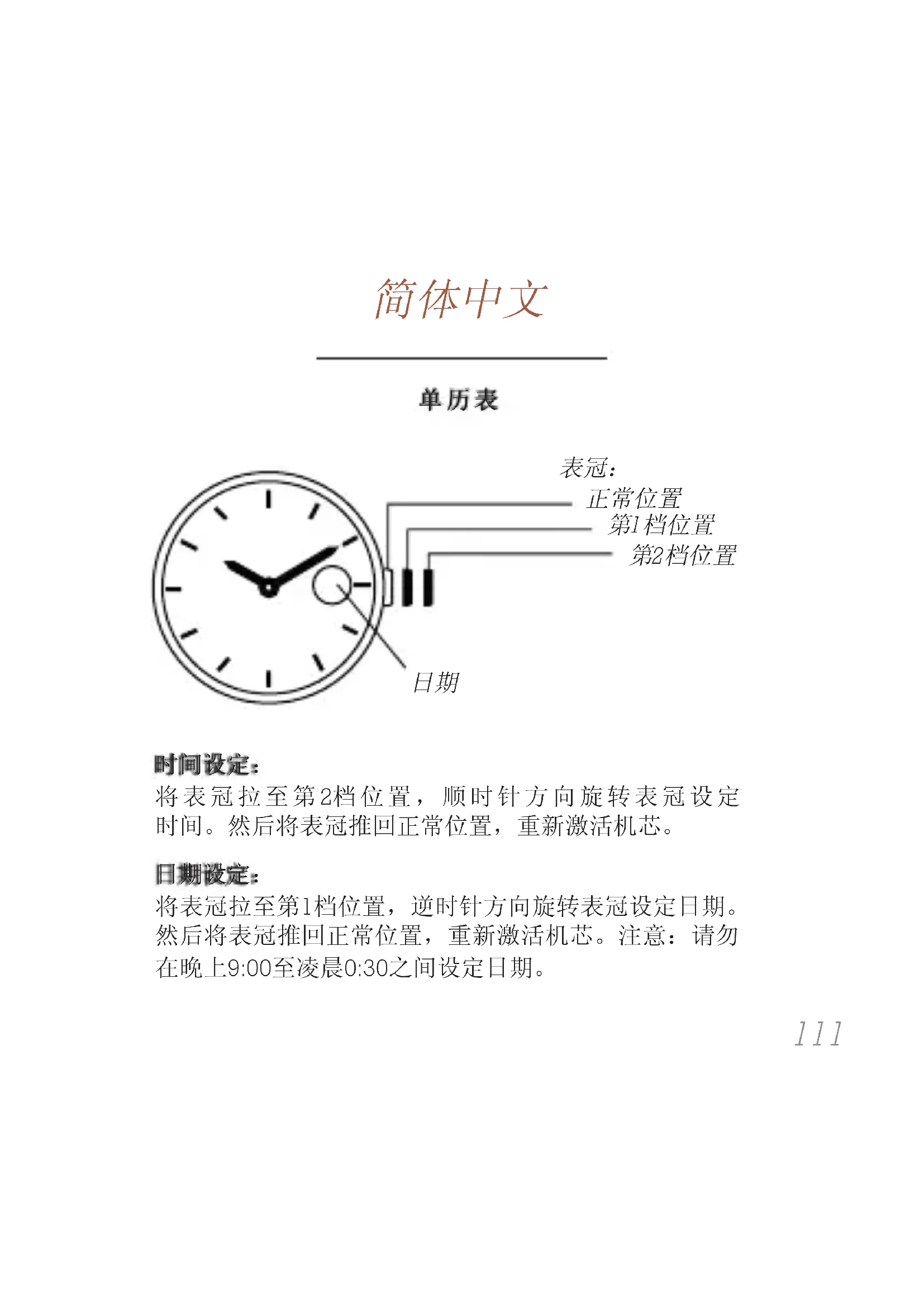 将表冠拉至第1档位置,逆时针方向旋转表冠设定日期。然后将表 冠推回正常位置,重新激活机芯。注意:请不要在晚上9:00至凌晨 0:30之间设定日期。 日期设定:113