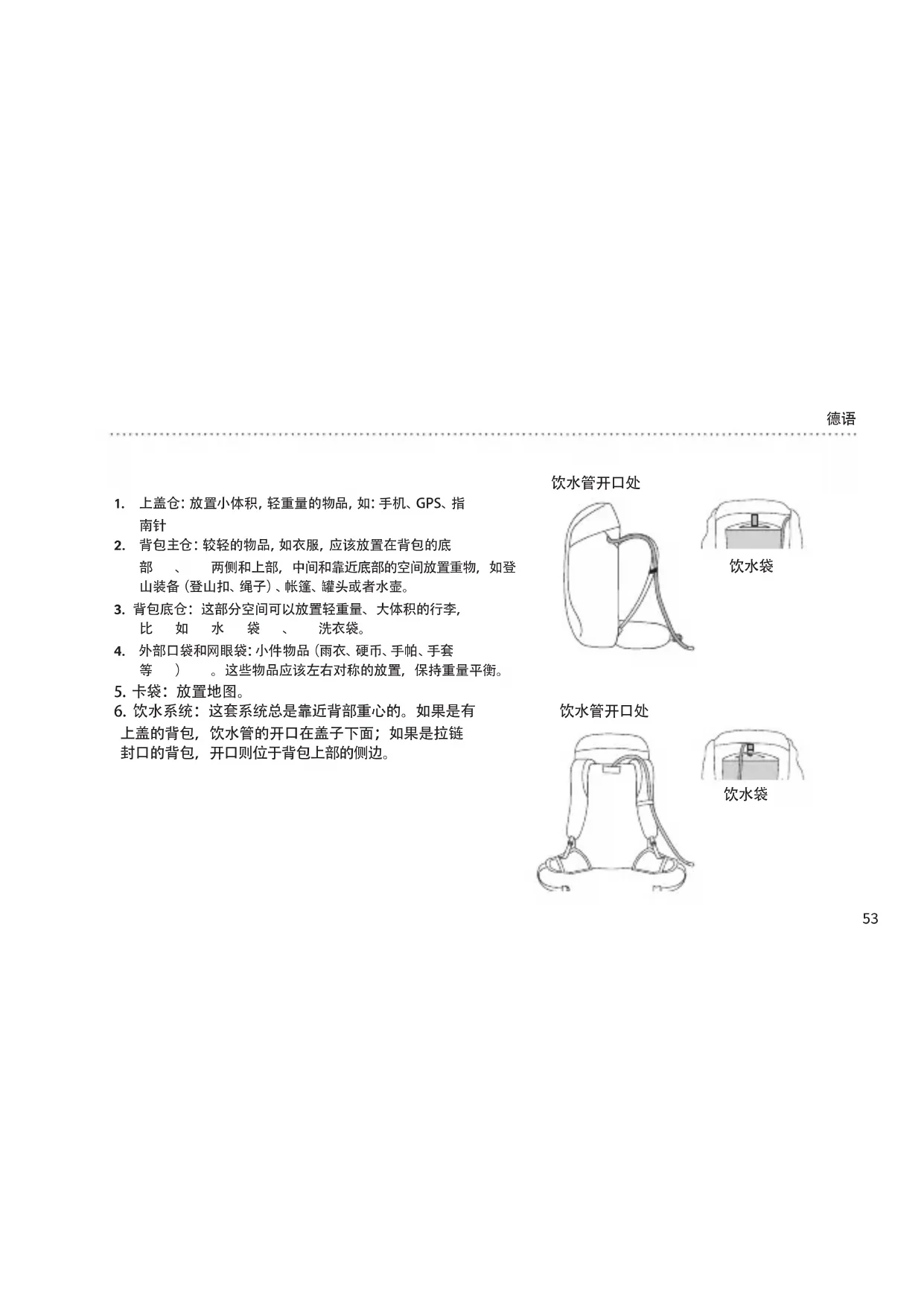 调整设置背包的具体步骤如下: 1. 肩带和负载定位腰带(上图1和2)抽紧,肩带放在锁 骨和肩膀之间。肩带松软面要靠身体放置,长度可以