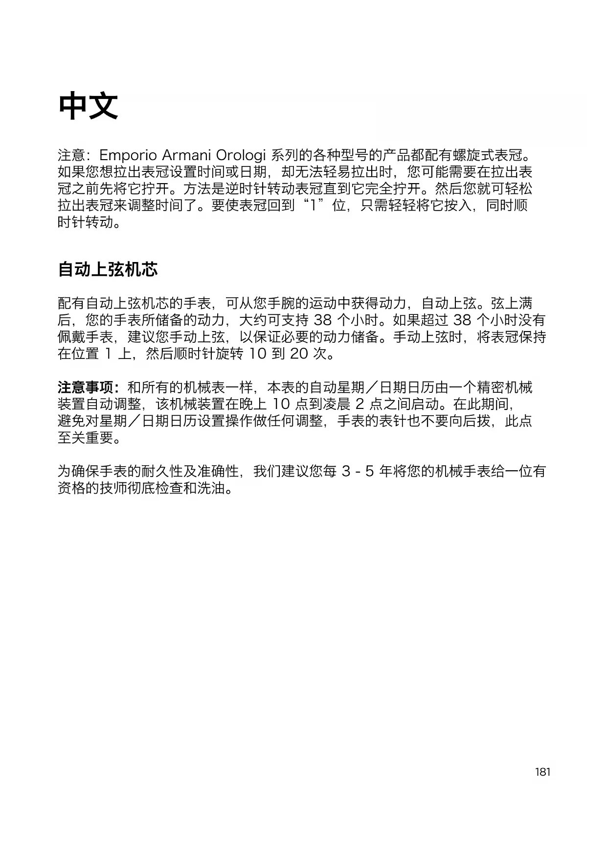 为确保手表的耐久性及准确性,我们建议您每 3 - 5 年将您的机械手表给一位有 资格的技师彻底检查和洗油。 SIMPLIFIED CHINESE182 2 指针和 3 指针