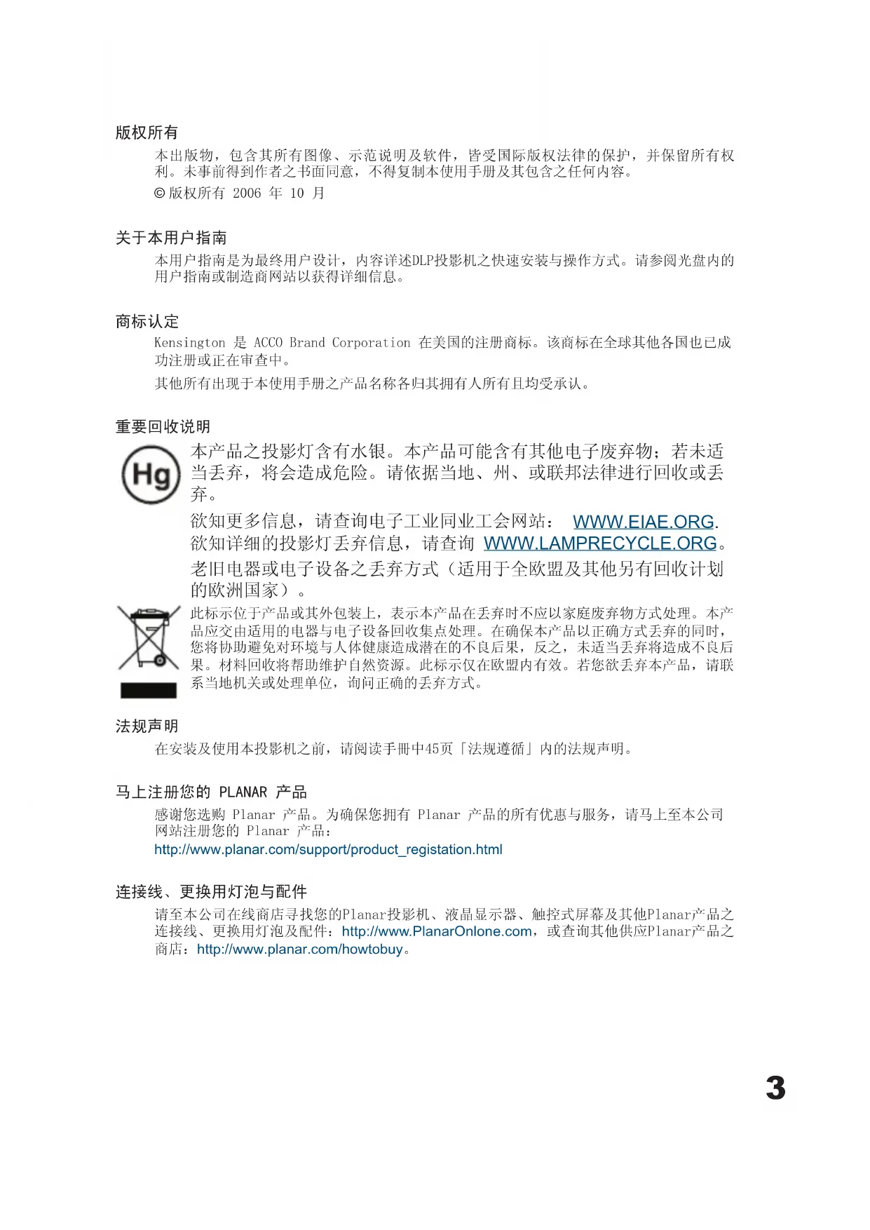 在安装及使用本投影机之前,请阅读手冊中45页「法规遵循」内的法规声明。 马上注册您的 PLANAR 产品 感谢您选购 Planar 产品。为确保您拥有 Planar 产品的所有优惠与服务,请马上至本公司 网站注册您的 Planar 产品: http://www.planar.com/support/product_registation.html 连接线、更换用灯泡与配件 请至本公司在线商店寻找您的Planar投影机、液晶显示器、触控式屏幕及其他Planar产品之 连接线、更换用灯泡及配件:http://www.PlanarOnlone.com,或查询其他供应Planar产品之 商店:http://www.planar.com/howtobuy。4