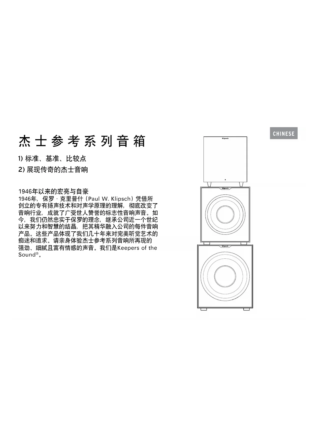 1946年以来的宏亮与自豪 1946年,保罗·克里普什 (Paul W. Klipsch) 凭借所 创立的专有扬声技术和对声学原理的理解,彻底改变了 音响行业,成就了广受世人赞誉的标志性音响声音。如 今,我们仍然忠实于保罗的理念,继承公司近一个世纪 以来努力和智慧的结晶,把其精华融入公司的每件音响 产品。这些产品体现了我们几十年来对完美听觉艺术的 痴迷和追求。请亲身体验杰士参考系列音响所再现的 强劲、细腻且富有情感的声音。我们是Keepers of the Sound