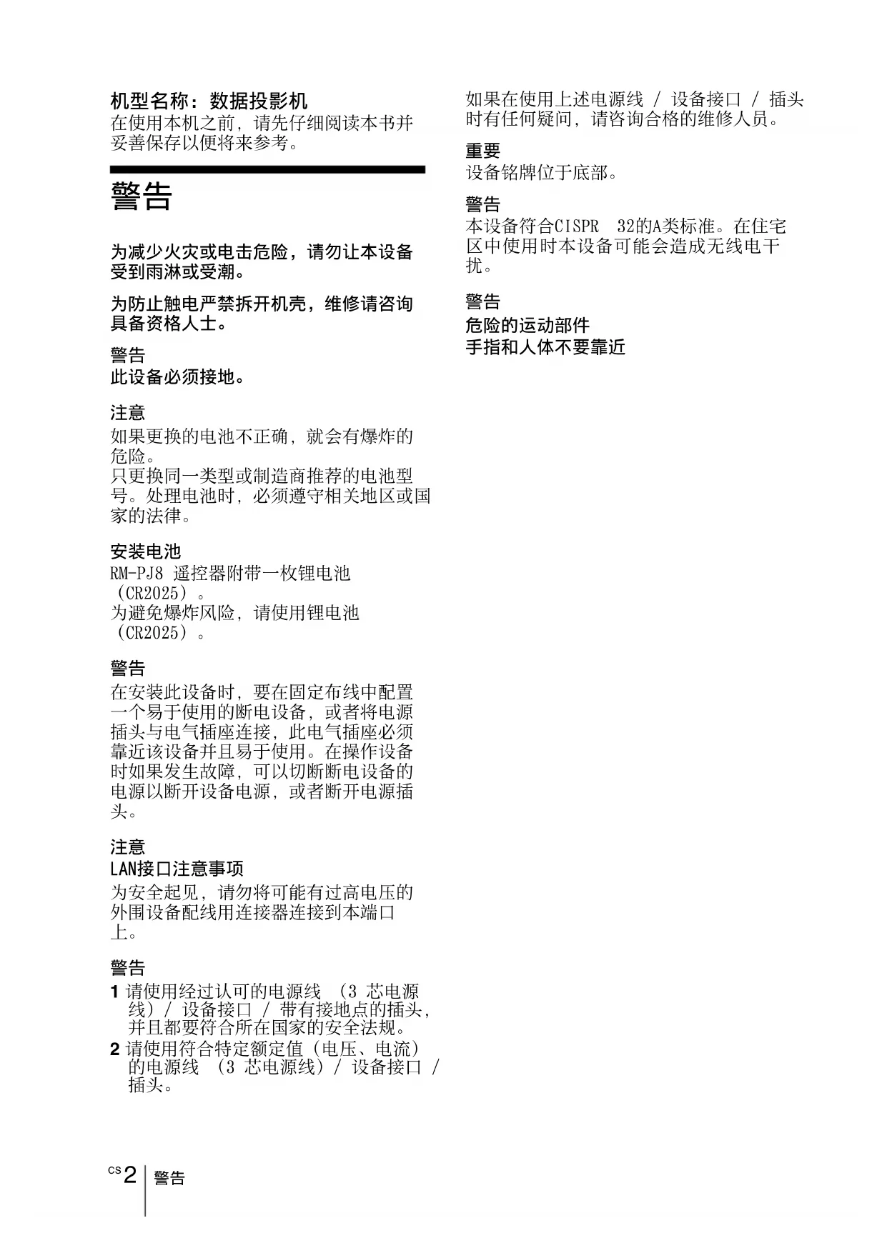 RM-PJ8 遥控器附带一枚锂电池 (CR2025)。 为避免爆炸风险,请使用锂电池 (CR2025)。