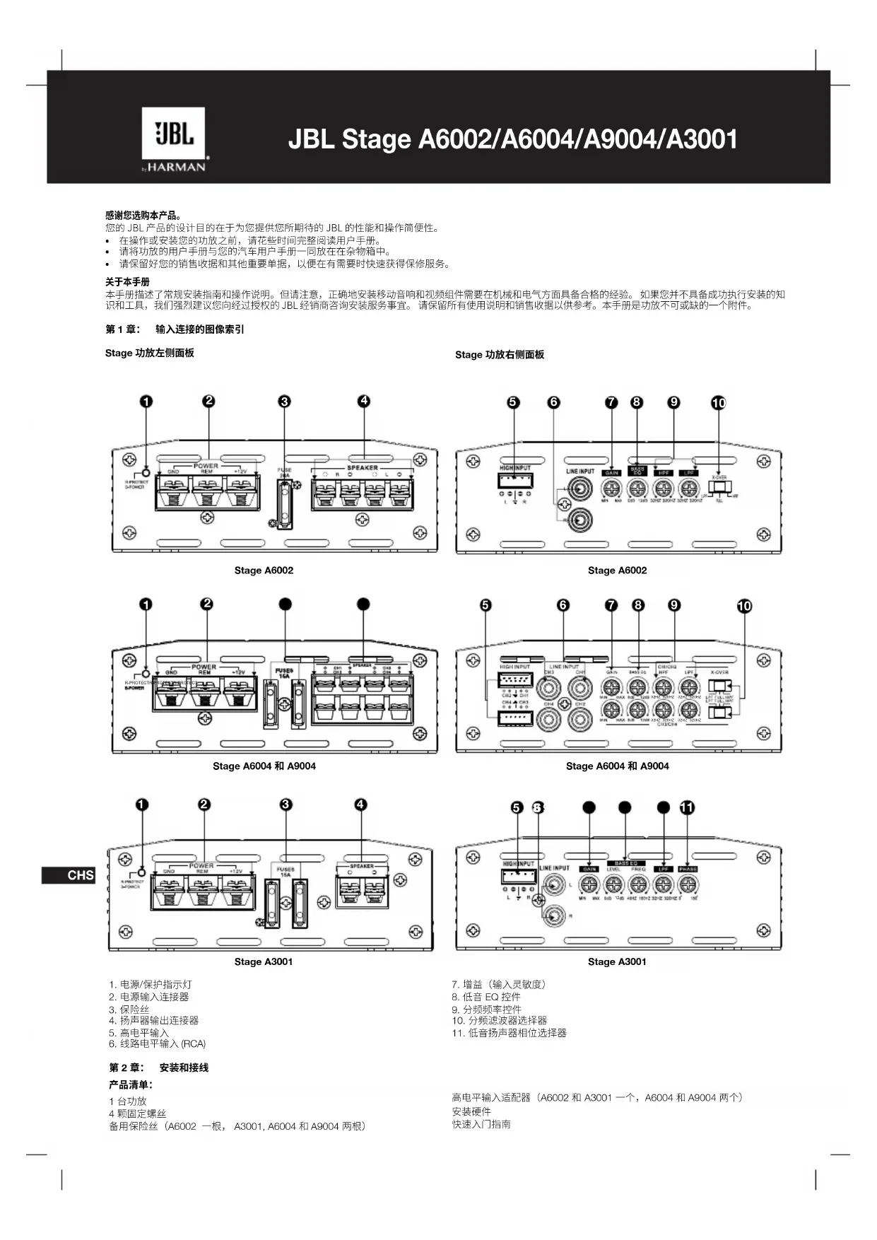 JBL Stage A6002/A6004/A9004/A3001 感謝您購買本產品 . . .JBL 產品提供符合使用者預期的出色效能與操作簡便性。• 在操作或安裝放大器之前,請先抽時間通讀本擁有者手冊。• 請將放大器的擁有者手冊連同汽車的車主手冊一起放在手套箱內。• 請將放大器銷售收據與其他重要票據放在一起,以便獲得所需的保固服務。關於本手冊本手冊描述了一般性安裝指南及操作說明。但請注意,正確安裝行動音訊與視訊元件需要具備合格的機械與電氣程序經驗。 若您缺乏成功執行本安裝的知識與工具,強烈建議您諮詢授權的 JBL 經銷商,以瞭解安裝方案。 請保留所有使用說明和銷售收據以供參考。 請將本手冊視為放大器的一個重要組件。第 1 章: 輸入連接的圖形索引Stage 放大器左側面板Stage A6002Stage A6004 和 A9004 Stage A6004 和 A9004Stage A3001Stage A6002Stage A30011. 電源/保護指示燈2. 電源輸入接口3. 保險絲4. 喇叭輸出接口5. 高電平輸入6. 線路電平輸入 (RCA)7. 增益(輸入靈敏度)8. 低音均衡器控制鈕9. 分頻頻率控制鈕10. 分頻濾波器選擇器11. 重低音喇叭相位選擇器Stage 放大器右側面板第 2 章: 安裝與連線包裝盒內物品:1 個放大器4 顆安裝螺釘 備用保險絲(A6002,1 根;A3001, A6004 和 A9004,2 根) 高電平輸入適配器(A6002 和 A3001,1 個;A6004 和 A9004,2 個)