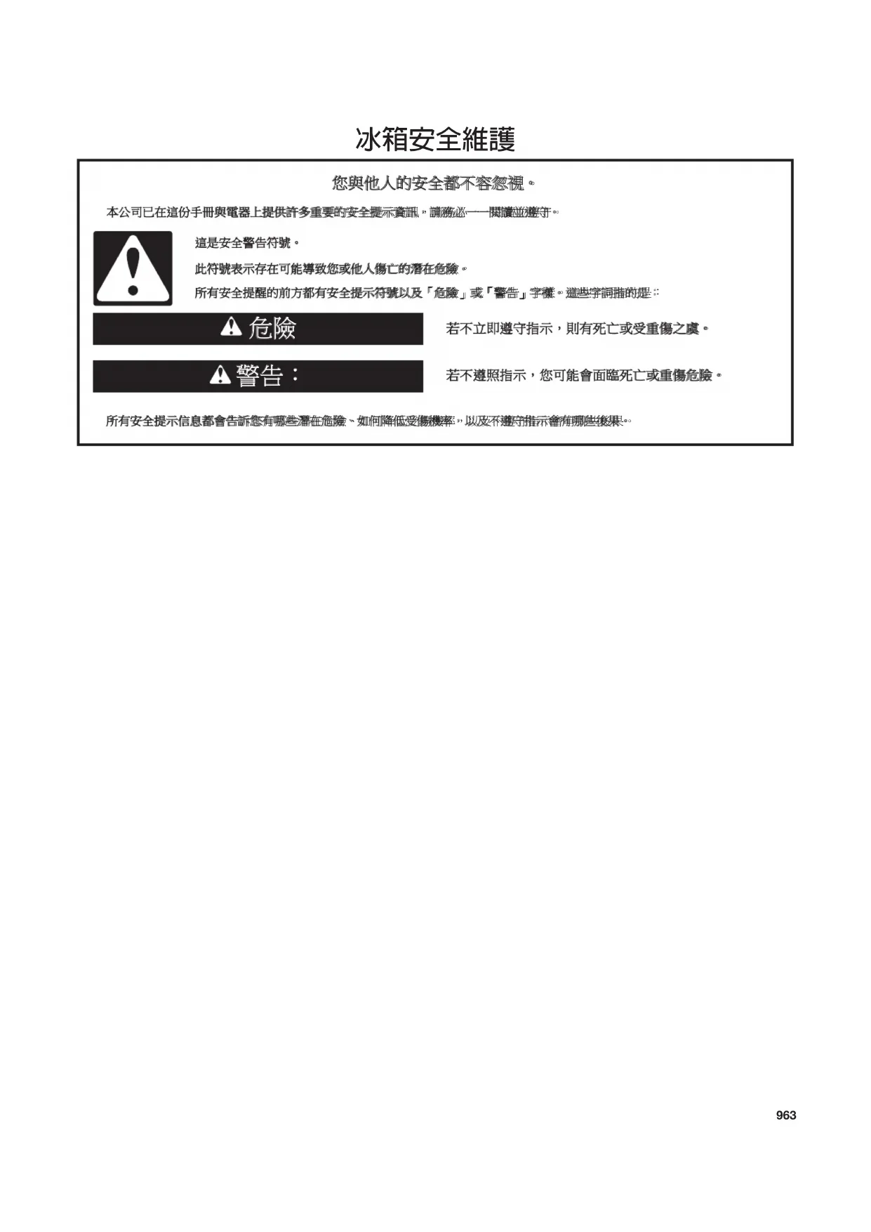 若不立即遵守指示,則有死亡或受重傷之虞。 若不遵照指示,您可能會面臨死亡或重傷危險。 所有安全提示信息都會告訴您有哪些潛在危險、如何降低受傷機率,以及不遵守指示會有哪些後果。 您與他人的安全都不容忽視。 本公司已在這份手冊與電器上提供許多重要的安全提示資訊,請務必一一閱讀並遵守。這是安全警告符號。所有安全提醒的前方都有安全提示符號以及「危險」或「警告」字樣。這些字詞指的是: