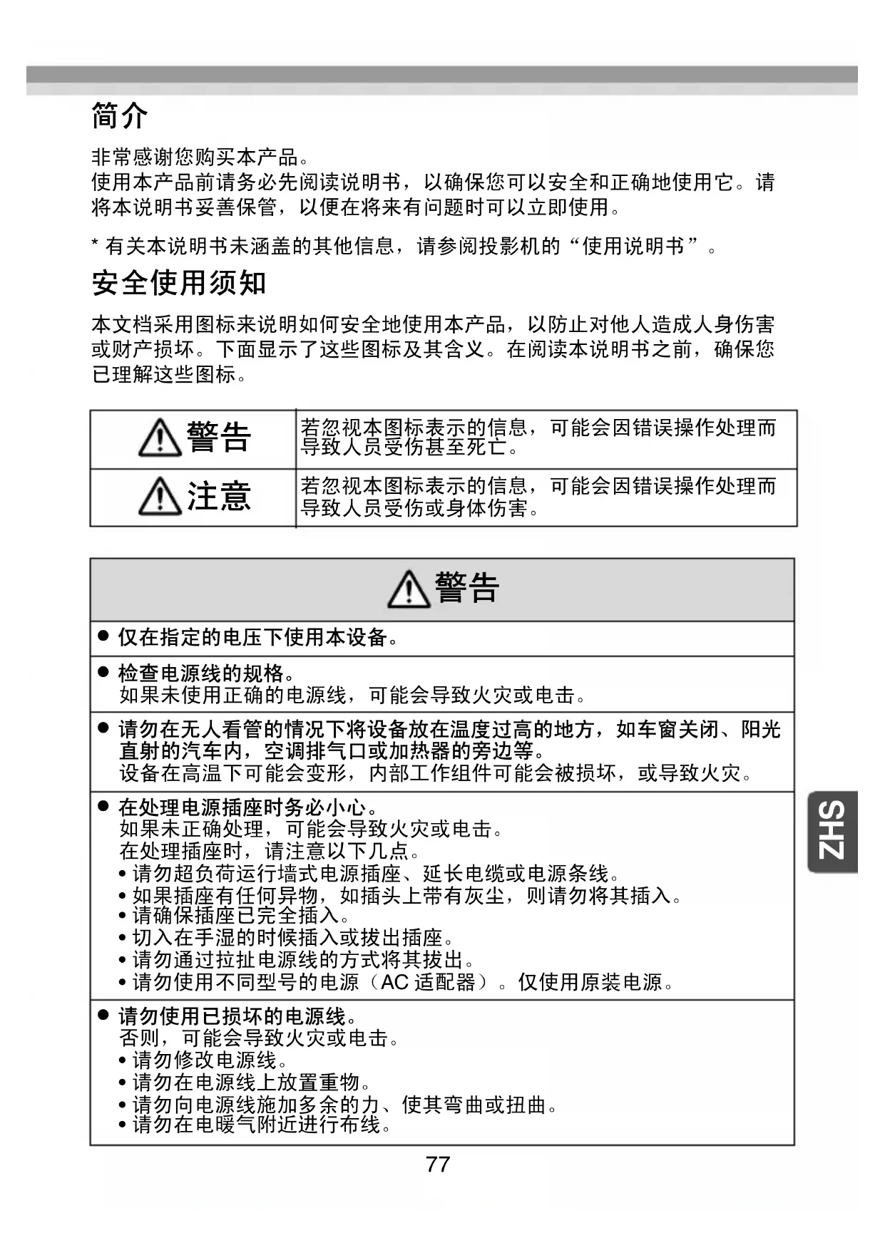 - 有关本说明书未涵盖的其他信息,请参阅投影机的“使用说明书”。