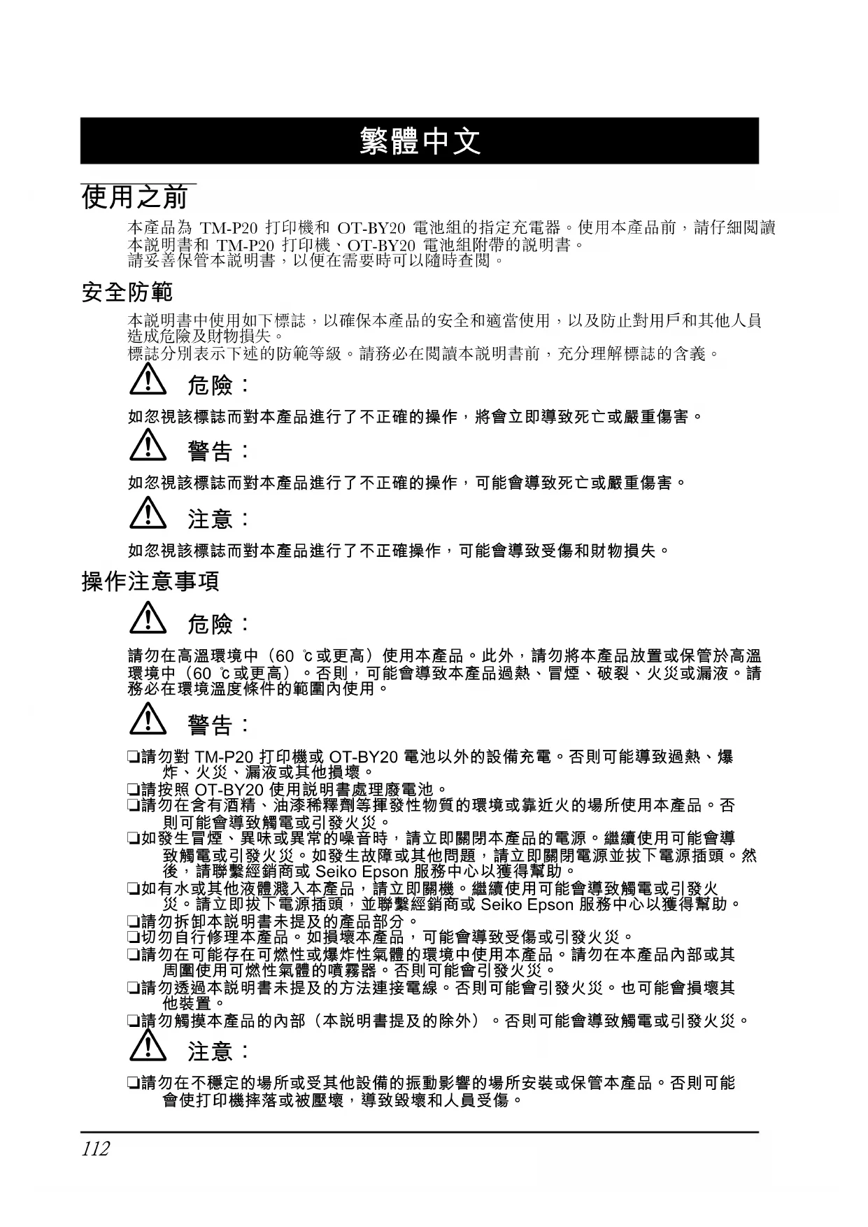 此為甲類資訊技術設備,於居住環境中使用時,可能會造成射頻擾動,在此種情況下,使用者會被要求採取某些適當的對策。如果將非屏蔽的印表機介面纜線與本印表機連接,將會使本裝置的 EMC 標準無效。此外,未經 Seiko Epson Corporation 明確許可的更改或修改,將導致您喪失操作本設備的權限。 本產品為 TM-P20 印表機和 OT-BY20 電池組的指定充電器。使用本產品前,請仔細閱讀本說明書和 TM-P20 印表機、OT-BY20 電池組附帶的說明書。請妥善保管本說明書,以便在需要時可以隨時查閱。 本說明書中使用如下標誌,以確保本產品的安全和適當使用,以及防止對用戶和其他人員造成危險及財產損害。標誌分別表示下述的防範等級。請務必在閱讀本說明書前,充分理解標誌的含義。 如忽視該標誌而對本產品進行了不正確的操作,將立即會導致死亡或嚴重傷害。 如忽視該標誌而對本產品進行了不正確的操作,可能會導致死亡或嚴重傷害。 如忽視該標誌而對本產品進行了不正確操作,可能會導致受傷和財產損害。
