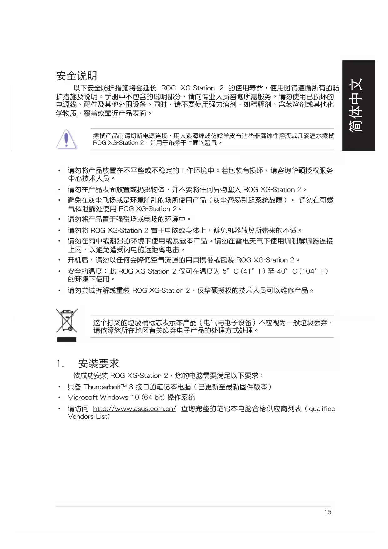 - 請勿嘗試拆解或重裝 ROG XG-Station 2,僅華碩授權的技術人員可以維修產品。 這個打叉的垃圾桶標誌表示本產品(電氣與電子設備)不應視為一般垃圾丟棄, 請依照您所在地區有關廢棄電子產品的處理方式處理。