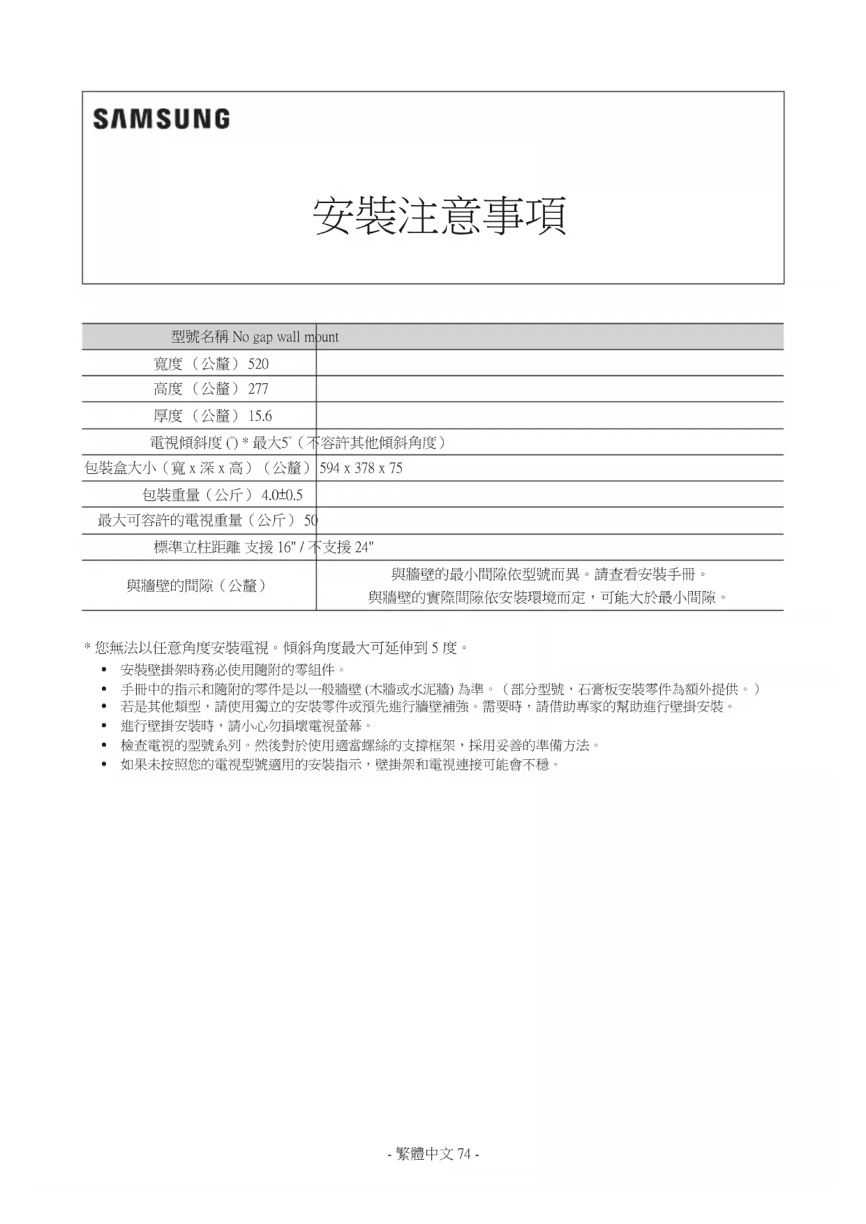 - 如果未按照您的電視型號適用的安裝指示,壁掛架和電視連接可能會不穩。- 繁體中文 74 - - 繁體中文 75 -