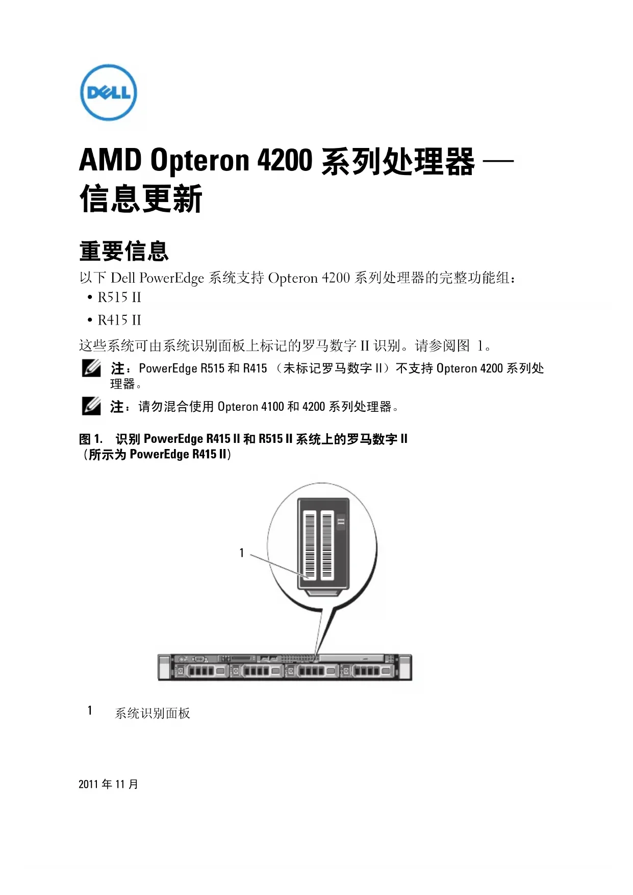 - R415 II 这些系统可由系统识别面板上标记的罗马数字 II 识别。请参阅图 1。 注:PowerEdge R515 和 R415 (未标记罗马数字 II)不支持 Opteron 4200 系列处