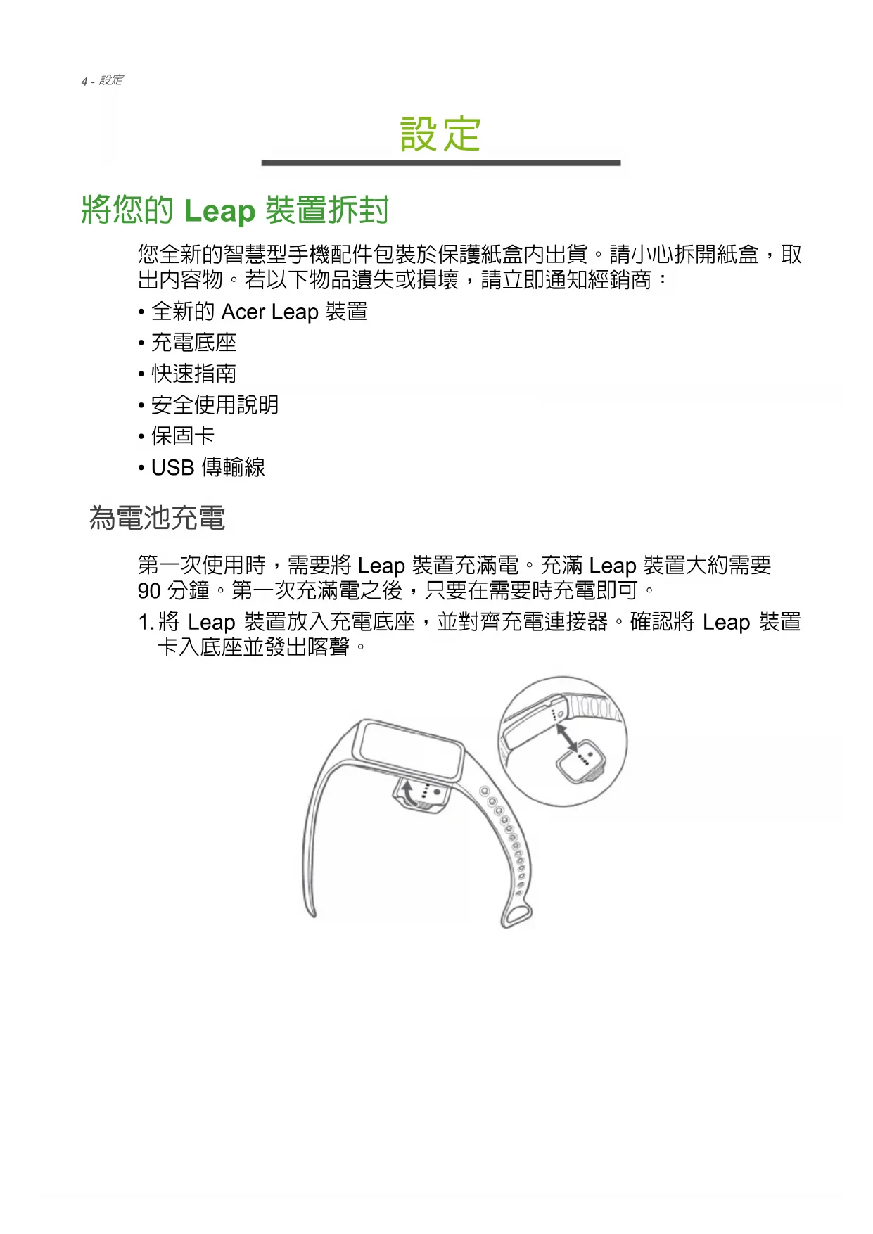 將您的 Leap 裝置拆封 您全新的智慧型手機配件包裝於保護紙盒內出貨。請小心拆開紙盒,取 出內容物。若以下物品遺失或損壞,請立即通知經銷商: