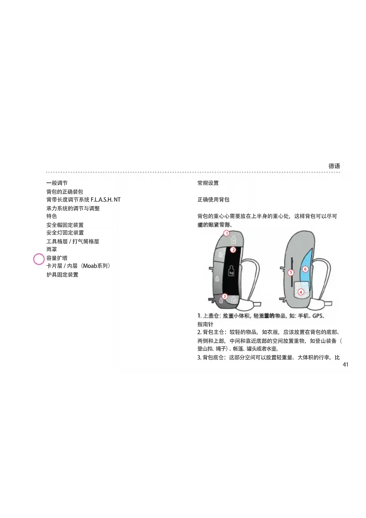 卡片层 / 内层(Moab系列) VAUDE 自行车系列的旅行背包在前方配有卡片层。在这里可 以快速拿取、安全地保管卡片。Moab系列的背包另有一个三 重内层。这里可以将一些重要的装备物件同主袋分开保管。 德语47