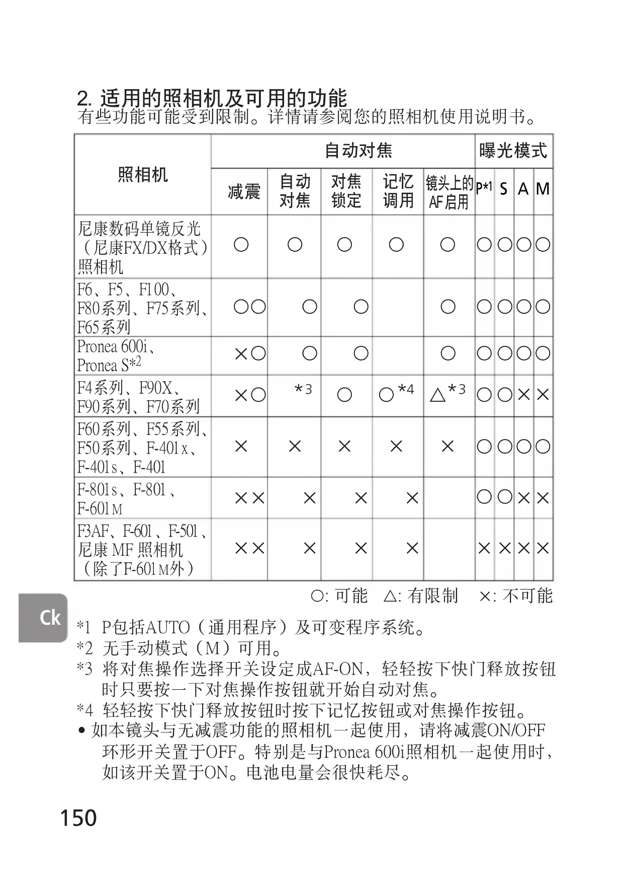 Ck2. 適用的照相機及可用的功能 有些功能可能受到限制-詳情請參閱您的照相機使用說明書- *1 P包括AUTO(通用程序)及可變程序系統- *2 無手動模式(M)可用- *3 將對焦操作選擇開關設定成AF-ON﹐輕輕按下快門釋放按鈕 時只要按一下對焦操作按鈕就開始自動對焦- *4 輕輕按下快門釋放按鈕時按下記憶按鈕或對焦操作按鈕-