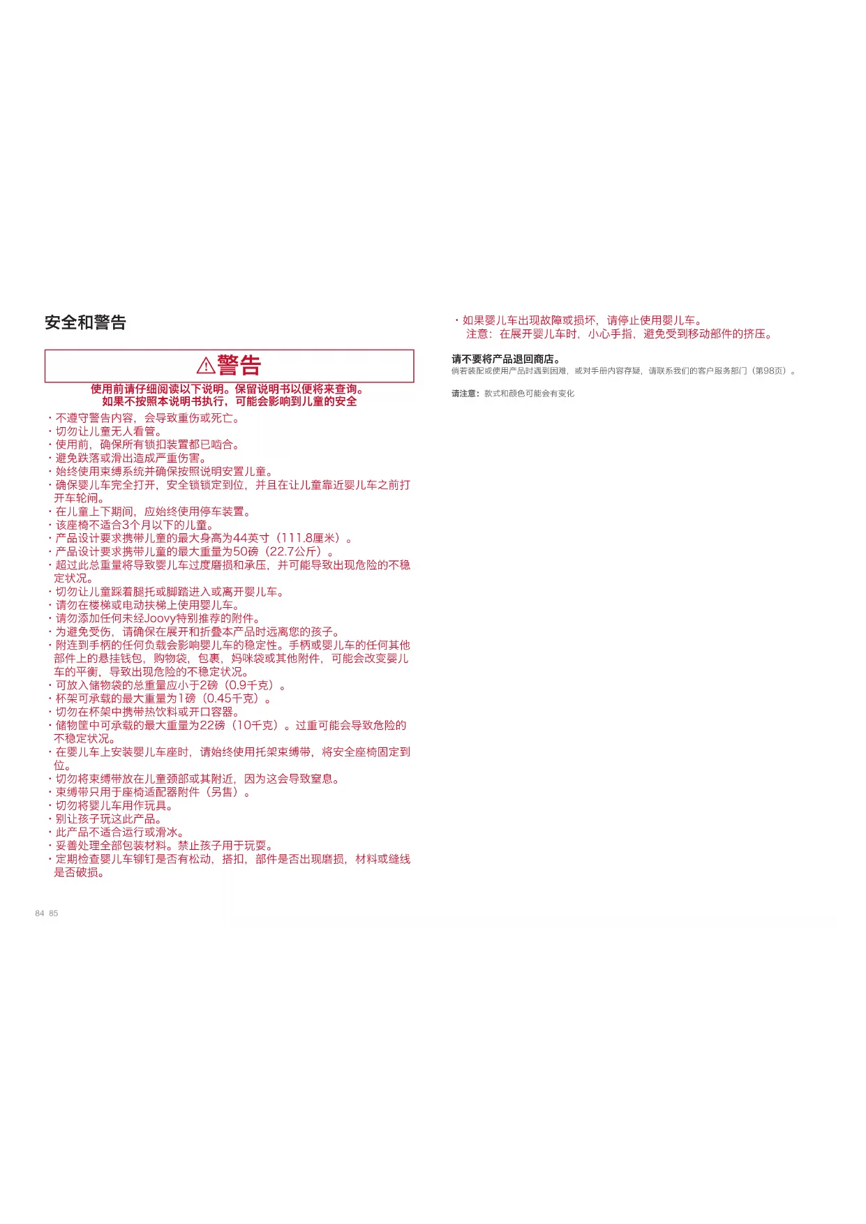 - 如果婴儿车出现故障或损坏,请停止使用婴儿车。 注意:在展开婴儿车时,小心手指,避免受到移动部件的挤压。 请不要将产品退回商店。 倘若装配或使用产品时遇到困难,或对手册内容存疑,请联系我们的客户服务部门(第98页)。 请注意:款式和颜色可能会有变化86 87