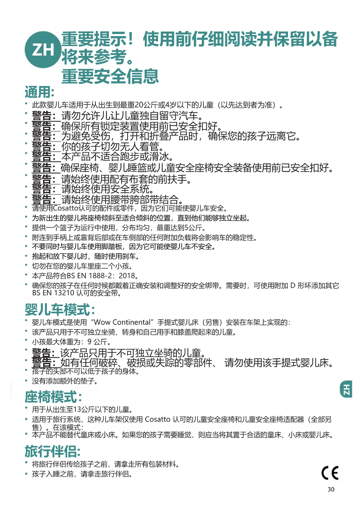 不要同时与婴儿车使用脚踏板,因为它可能使婴儿车不安全。 抱起和放下婴儿时,随时使用刹车。 切勿在您的婴儿车里座二个小孩。 本产品符合BS EN 1888-2:2018。 确保您的孩子在任何时候都戴着正确安装和调整好的安全绑带。需要时,可使用附加 D 形环添加其它 BS EN 13210 认可的安全带。