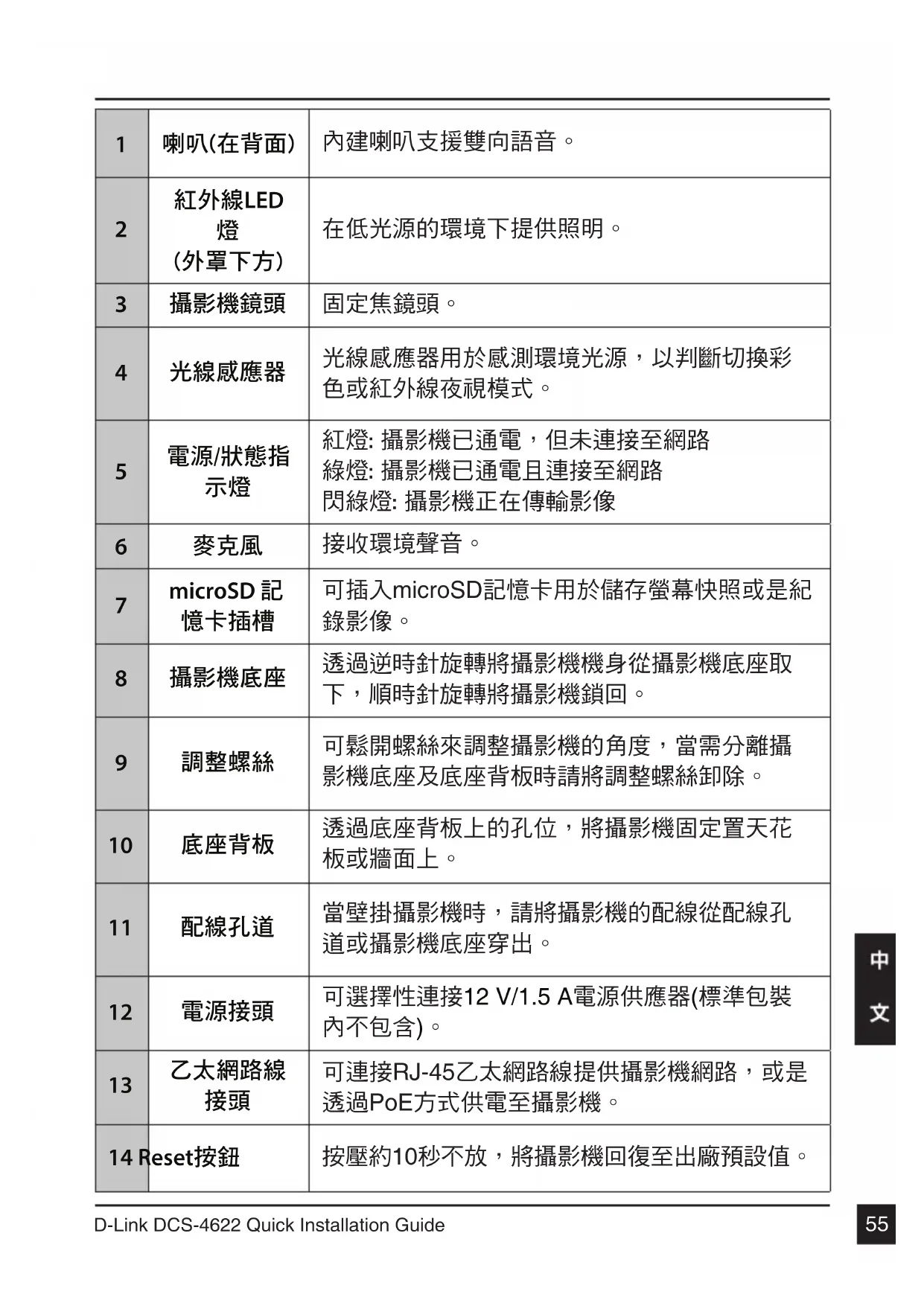 可連接RJ-45乙太網路線提供攝影機網路,或是 透過PoE方式供電至攝影機。 14 Reset按鈕 按壓約10秒不放,將攝影機回復至出廠預設值。D-Link DCS-4622 Quick Installation Guide