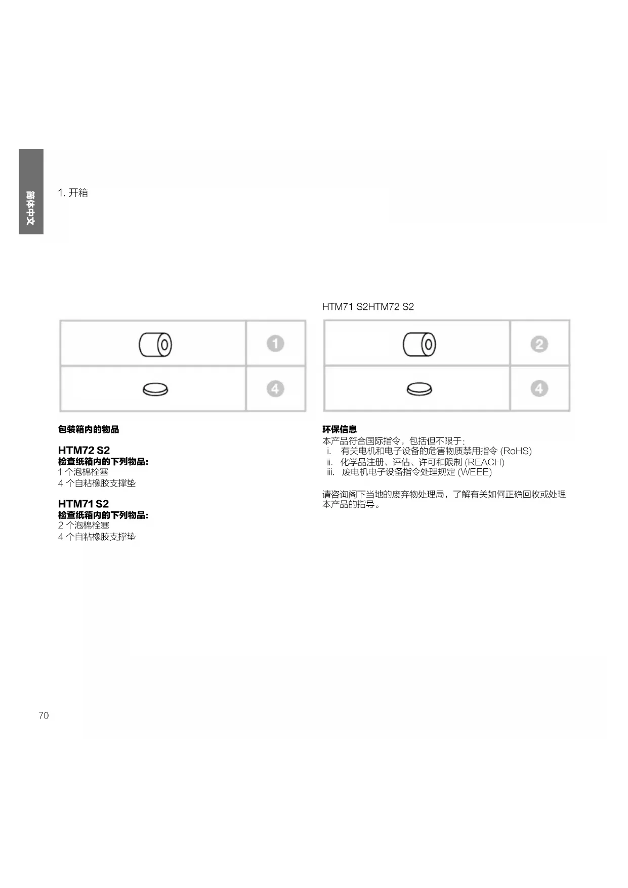 HTM72 S2 检查纸箱内的下列物品: 1 个泡棉栓塞 4 个自粘橡胶支撑垫 HTM71 S2 检查纸箱内的下列物品: 2 个泡棉栓塞 4 个自粘橡胶支撑垫