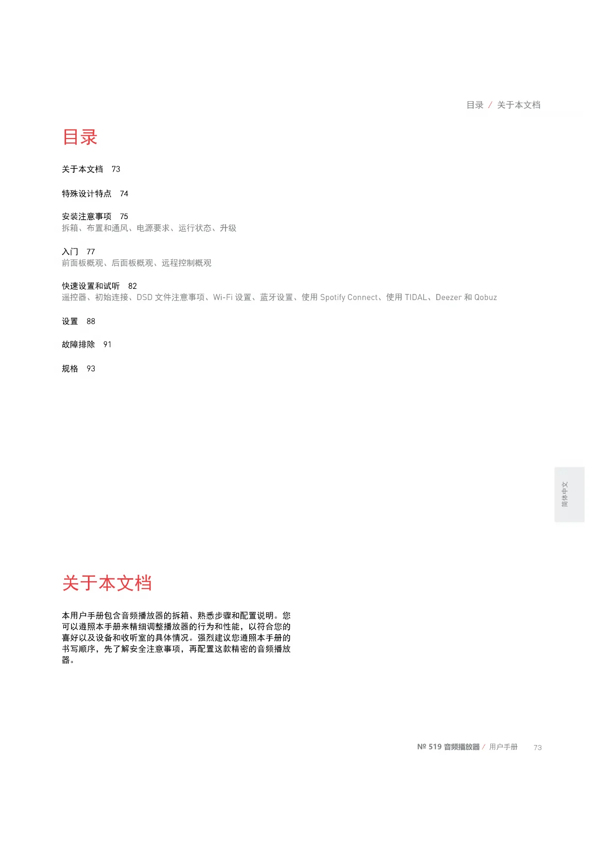 关于本文档 73 特殊设计特点 74 安装注意事项 75 拆箱、布置和通风、电源要求、运行状态、升级 入门 77 前面板概观、后面板概观、远程控制概观 快速设置和试听 82 遥控器、初始连接、DSD 文件注意事项、Wi-Fi 设置、蓝牙设置、使用 Spotify Connect、使用 TIDAL、Deezer 和 Qobuz 设置 88 故障排除 91 规格 93 本用户手册包含音频播放器的拆箱、熟悉步骤和配置说明。您 可以遵照本手册来精细调整播放器的行为和性能,以符合您的 喜好以及设备和收听室的具体情况。强烈建议您遵照本手册的 书写顺序,先了解安全注意事项,再配置这款精密的音频播放