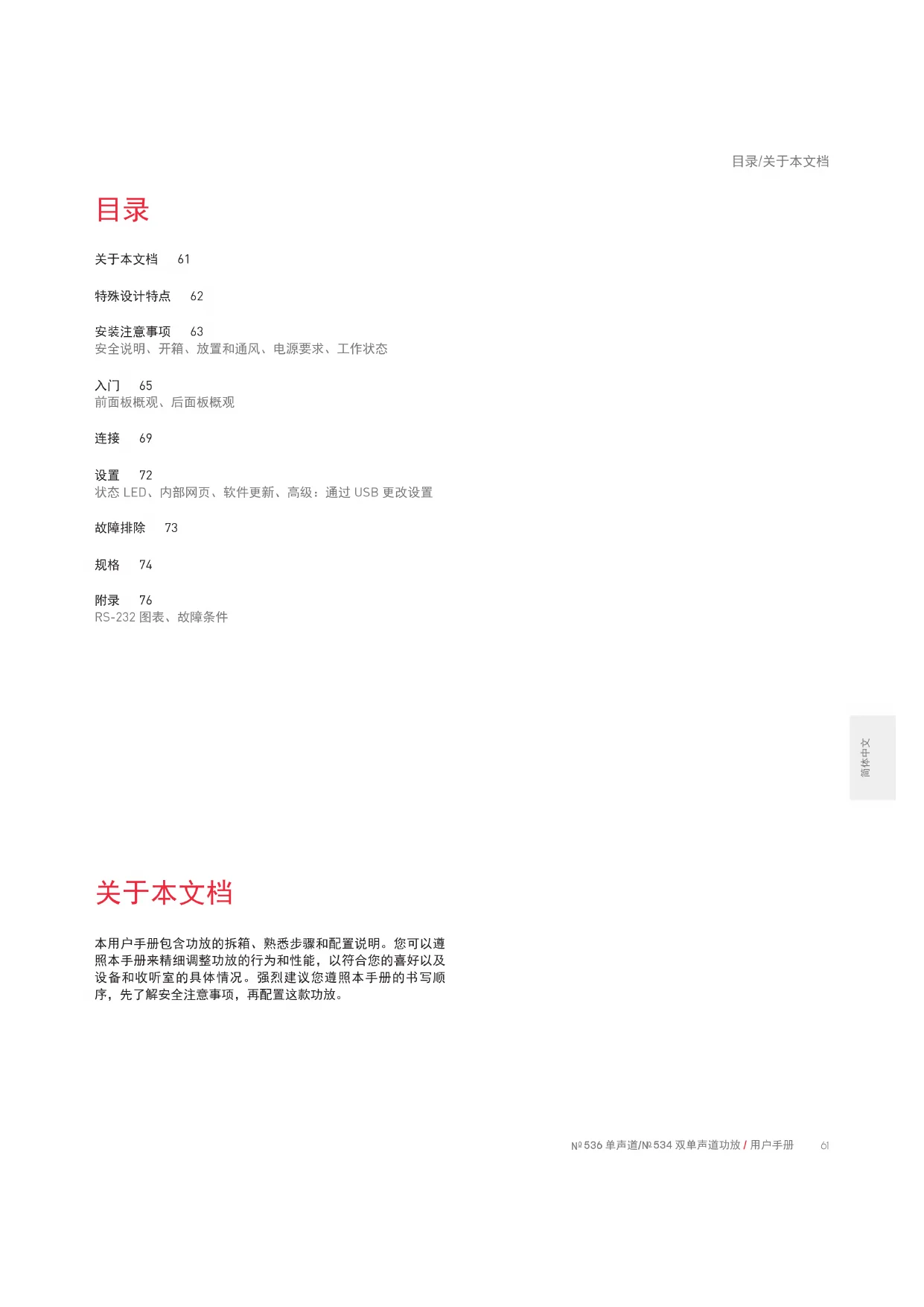 关于本文档 61 特殊设计特点 62 安装注意事项 63 安全说明、开箱、放置和通风、电源要求、工作状态 入门 65 前面板概观、后面板概观 连接 69 设置 72 状态 LED、内部网页、软件更新、高级:通过 USB 更改设置 故障排除 73 规格 74 附录 76 RS-232 图表、故障条件 本用户手册包含功放的拆箱、熟悉步骤和配置说明。您可以遵 照本手册来精细调整功放的行为和性能,以符合您的喜好以及 设备和收听室的具体情况。强烈建议您遵照本手册的书写顺 序,先了解安全注意事项,再配置这款功放。