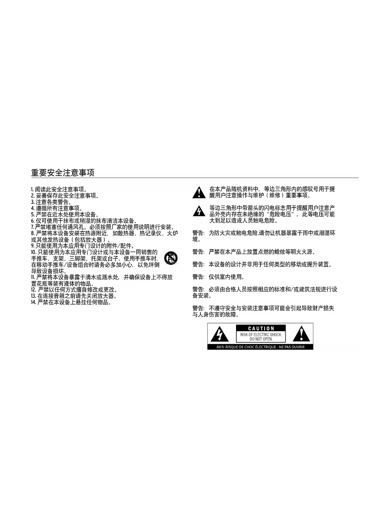 重要安全注意事项警告:严禁打开!触电危险。本设备中的 电压对生命有害。本设备不含用户可维修部 件。所有维修工作均应由合格的维修人员完