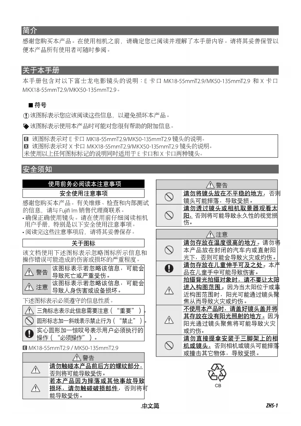 本手册包含对以下富士龙电影镜头的说明 :E 卡口 MK18-55mmT2.9/MK50-135mmT2.9 和 X 卡口 MKX18-55mmT2.9/MKX50-135mmT2.9。