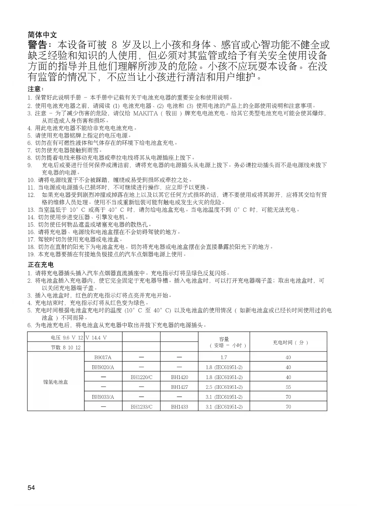 3. 注意 - 为了减少伤害的危险,请仅给 MAKITA ( 牧田 ) 牌充电电池充电。给其它类型电池充电可能会使其爆炸,
