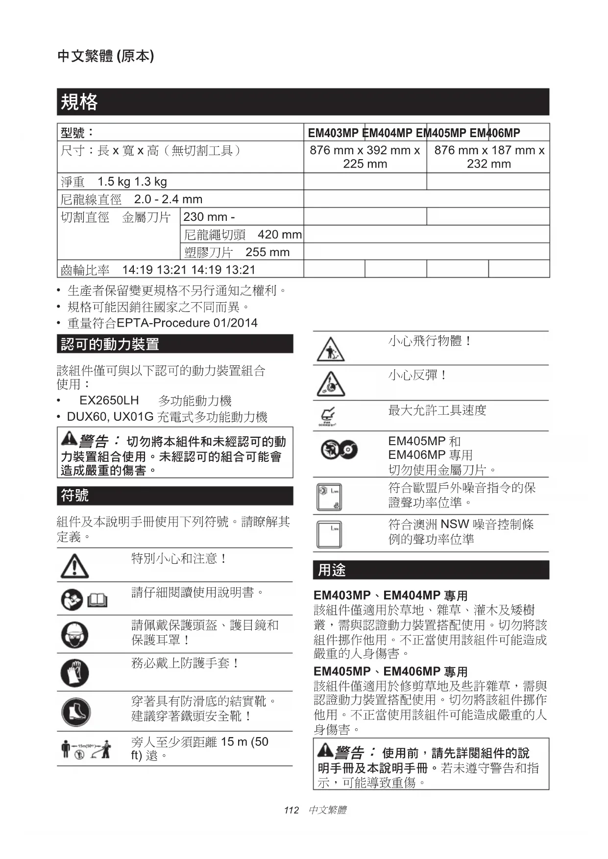 EM405MP、EM406MP 專用 該組件僅適用於修剪草地及些許雜草,需與 認證動力裝置搭配使用。切勿將該組件挪作 他用。不正當使用該組件可能造成嚴重的人
