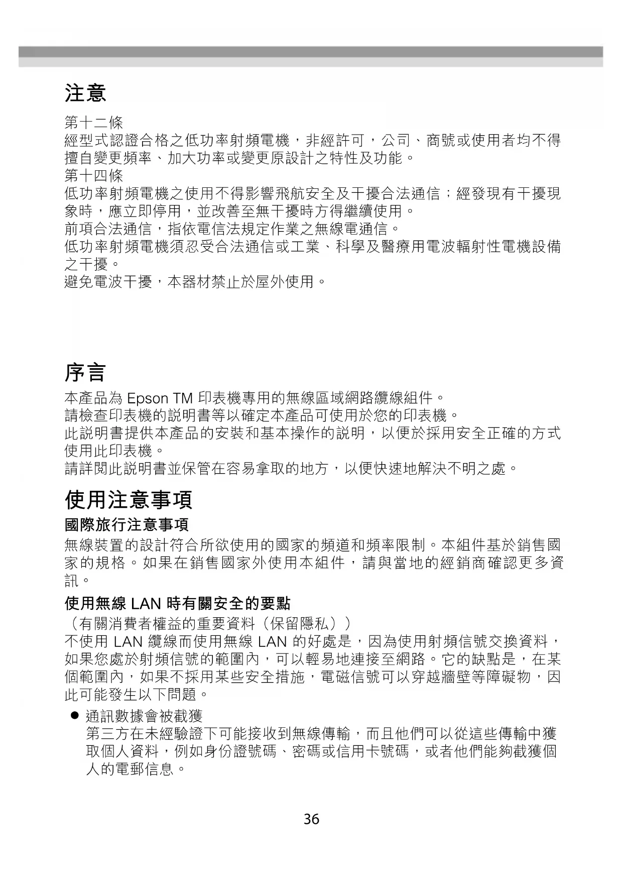 使用無線 LAN 時有關安全的要點 (有關消費者權益的重要資料(保留隱私)) 不使用 LAN 纜線而使用無線 LAN 的好處是,因為使用射頻信號交換資料, 如果您處於射頻信號的範圍內,可以輕易地連接至網路。它的缺點是,在某 個範圍內,如果不採用某些安全措施,電磁信號可以穿越牆壁等障礙物,因
