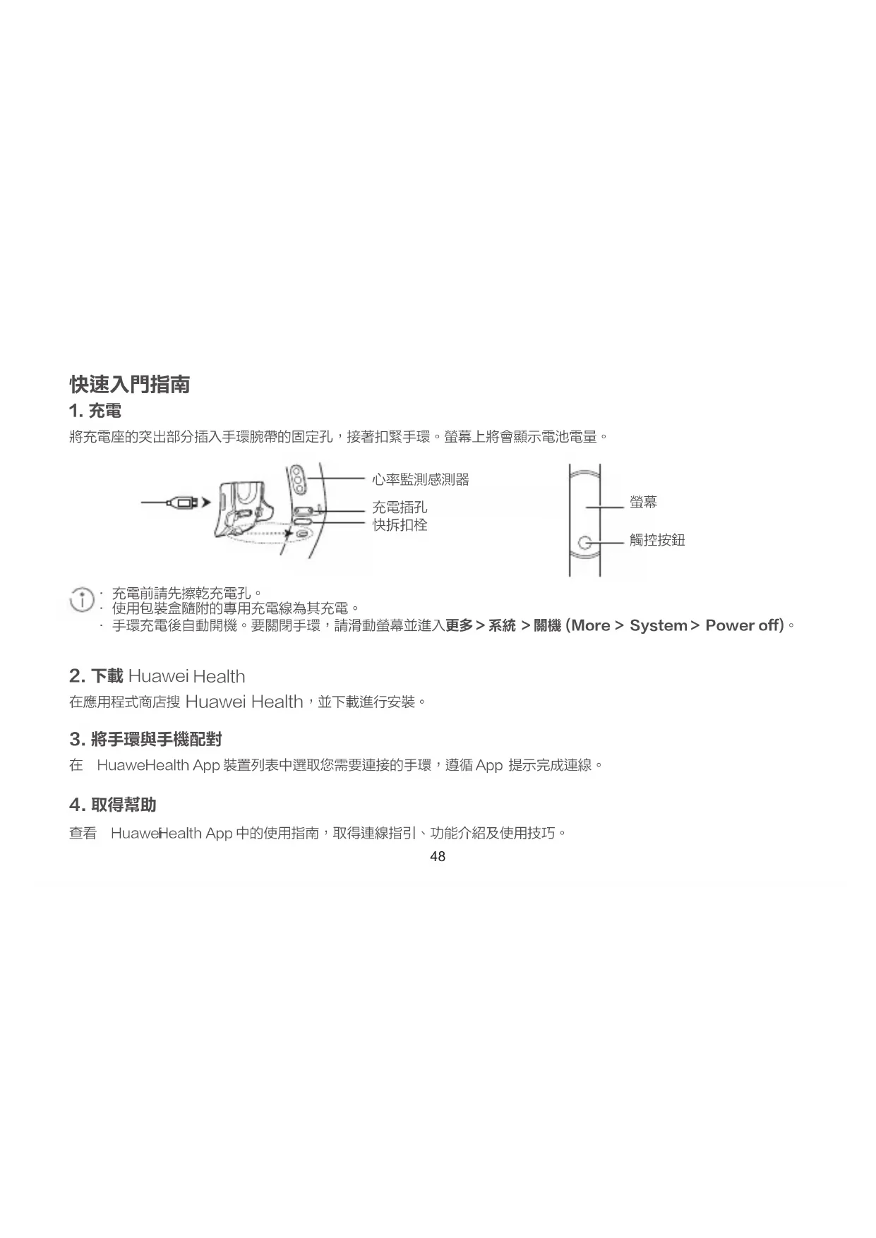 查看 Huawei Health App 中的使用指南,取得連線指引、功能介紹及使用技巧。48 49
