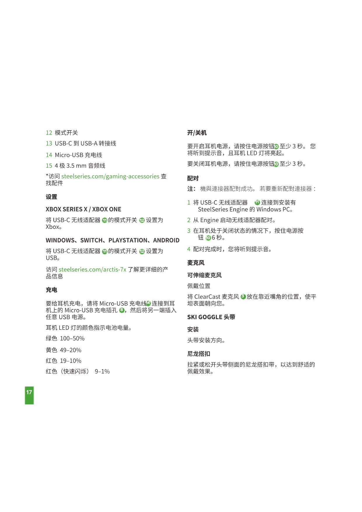 1 滑雪镜头带* 2 Airweave 耳垫* 3 ClearCast 麦克风 4 麦克风静音按钮 5 音量控制钮 6 移动电缆插孔 7 耳机共享插孔 8 Micro-USB 充电插孔 9 ChatMix Dial 10 电源按钮 11 USB-C 无线适配器17 12 模式开关 13 USB-C 到 USB-A 转接线 14 Micro-USB 充电线 15 4 极 3.5 mm 音频线 *访问 steelseries.com/gaming-accessories 查