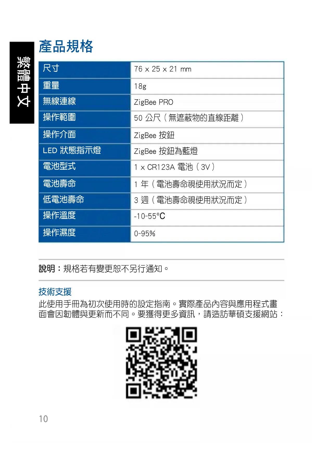)與濕度(0~95%)。 ZigBee 按鈕 按下此按鈕與智慧管家連線。按住約 5 秒重置裝置。 說明:請確認重置您的華碩智慧家庭裝置並從專屬應用程 式中將此裝置完全刪除。
