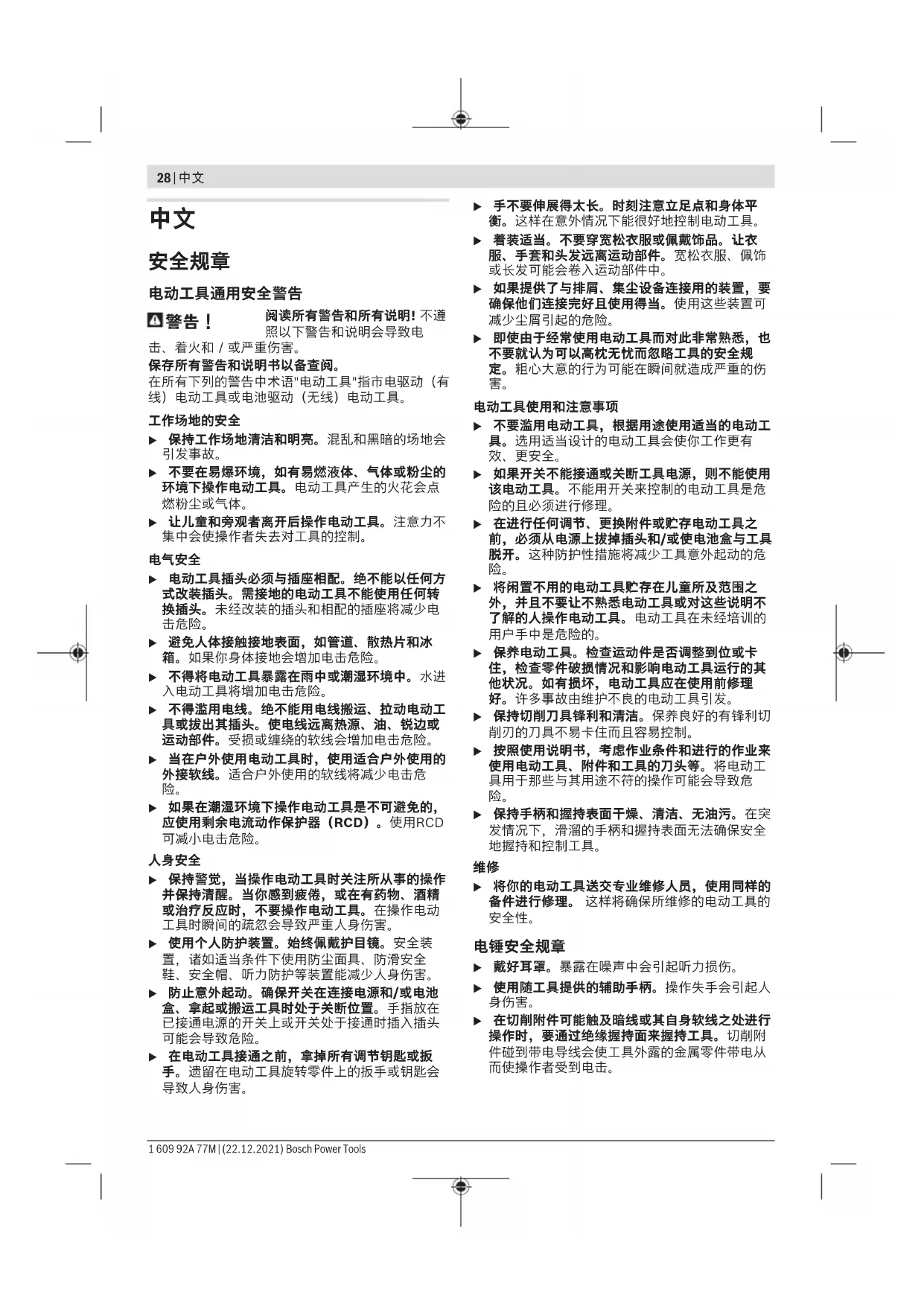u 保持警覺,當操作電動工具時關注所從事的操作 並保持清醒。 當您感到疲倦,或在有藥物、酒精 或治療反應時,不要操作電動工具。在操作電動 工具時瞬間的疏忽會導致嚴重人身傷害。 Bosch Power Tools 1 609 92A 77M | (22.12.2021)34 | 繁體中文 u 使用個人防護裝置。 始終佩戴護目鏡。安全裝 置,諸如適當條件下使用防塵面具、防滑安全 鞋、安全帽、聽力防護等裝置能減少人身傷害。 u 防止意外起動。 確保開關在連接電源和/或電池 盒、拿起或搬運工具時處於關閉位置。手指放在 已接通電源的開關上或開關處於接通時插入插頭