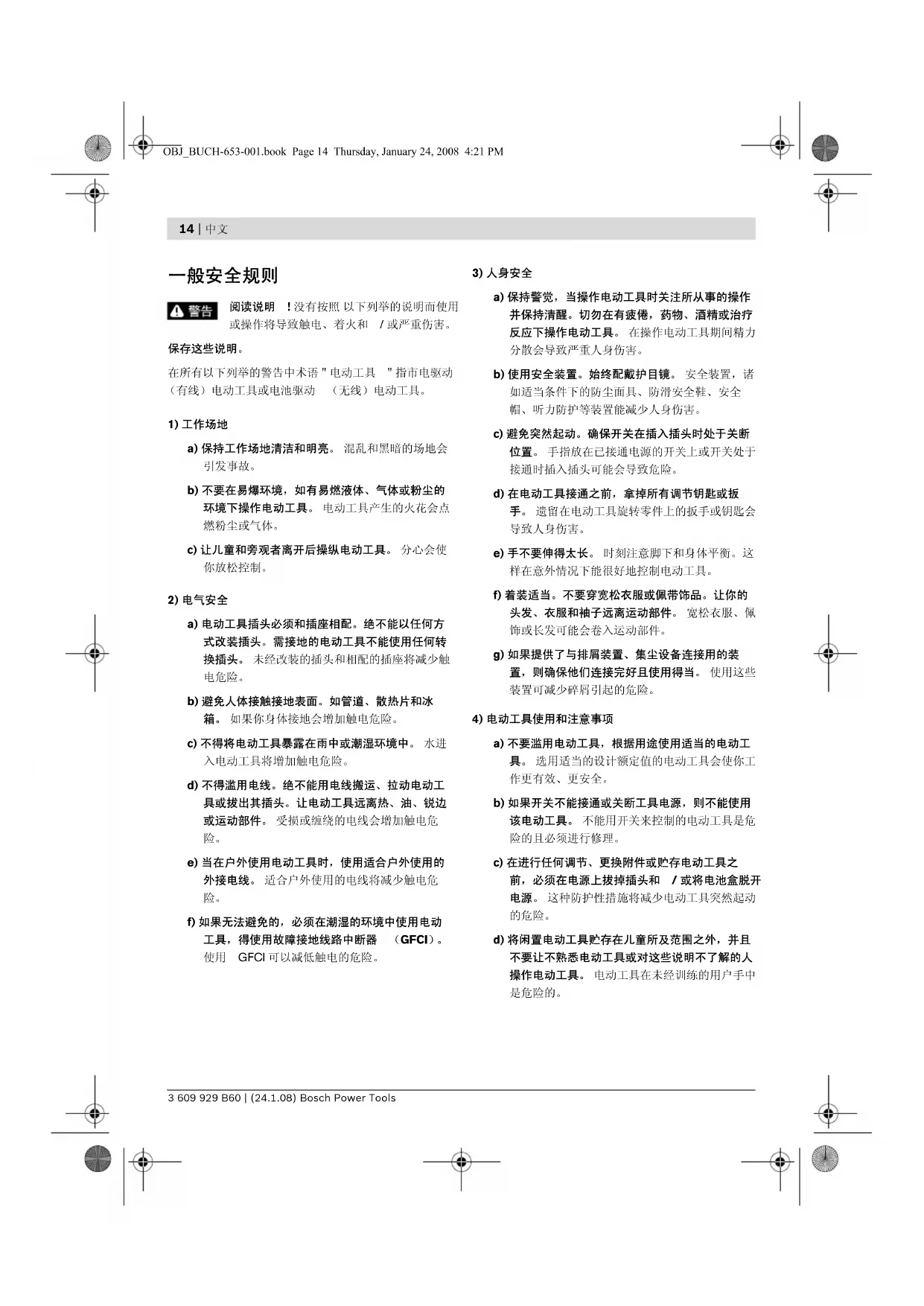 OBJ_BUCH-653-001.book Page 14 Thursday, January 24, 2008 4:21 PM中文 | 15 Bosch Power Tools 3 609 929 B60 | (24.1.08) e) 保养电动工具。检查运动件的安装偏差或卡住、 零件破损情况和影响电动工具运行的其他条件。 如有损坏,电动工具必须在使用前修理好。 许多 事故由维护不良的电动工具引发。 f) 保持切削刀具锋利和清洁。 保养良好的有锋利切 削刃的刀具不易卡住而且容易控制。 g) 按照使用说明书以及打算使用的电动工具的特殊 类型要求的方式,考虑作业条件和进行的作业来 使用电动工具、附件和工具的刀头等。 将电动工 具用作那些与要求不符的操作可能会导致危险情