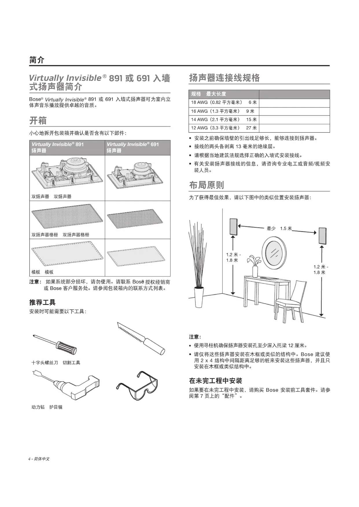 双扬声器 双扬声器双扬声器格栅 双扬声器格栅模板 模板注意: 如果系统部分损坏,请勿使用。请联系 Bose 授权经销商或 Bose 客户服务处。请参阅包装箱内的联系方式列表。 安装时可能需要以下工具:十字头螺丝刀 切割工具动力钻 护目镜 规格 最大长度18 AWG(0.82 平方毫米) 6 米16 AWG(1.3 平方毫米) 9 米14 AWG(2.1 平方毫米) 15 米12 AWG(3.3 平方毫米) 27 米• 安装之前确保墙壁的引出线足够长,能够连接到扬声器。• 接线的两头各剥离 13 毫米的绝缘层。• 请根据当地建筑法规选择正确的入墙式安装接线。