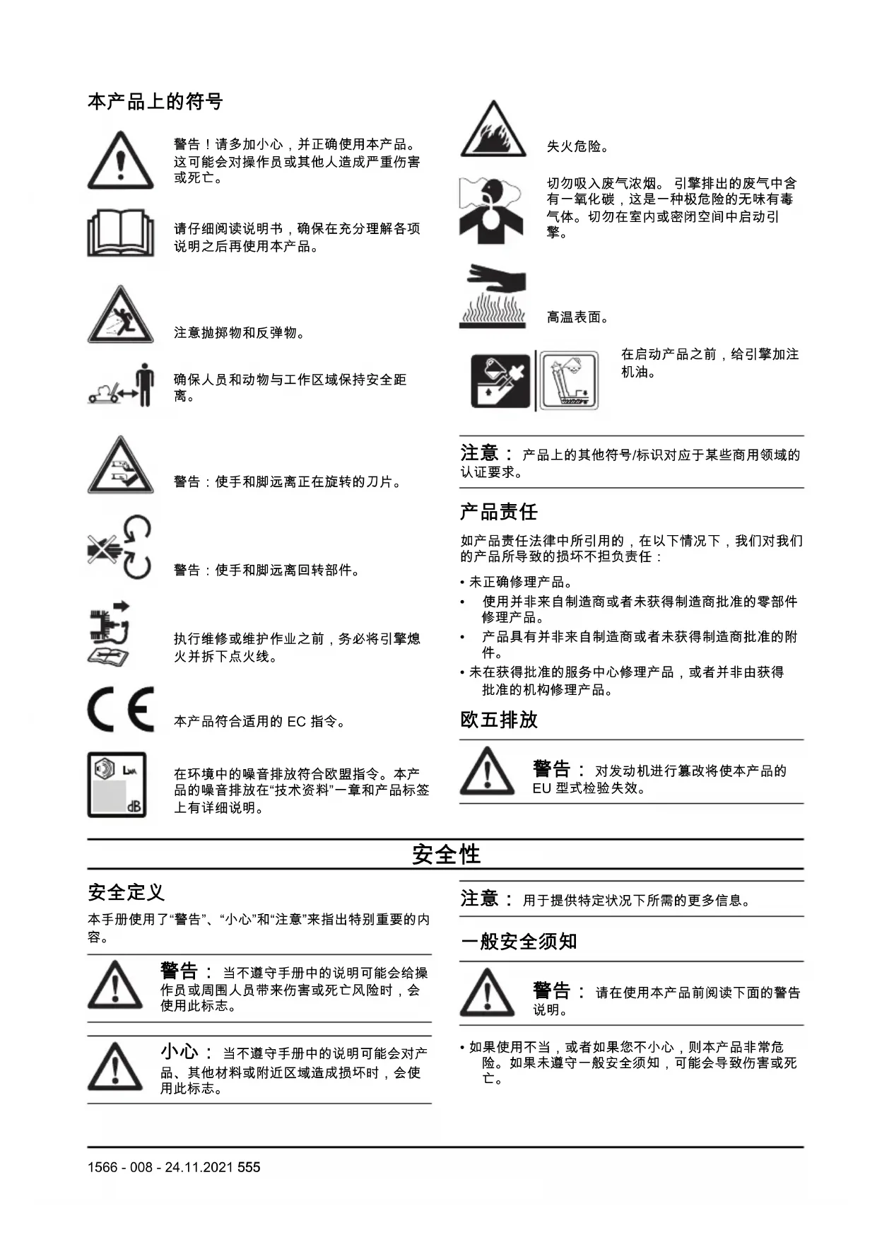 554 1566 - 008 - 24.11.2021本产品上的符号 警告!请多加小心,并正确使用本产品。 这可能会对操作员或其他人造成严重伤害