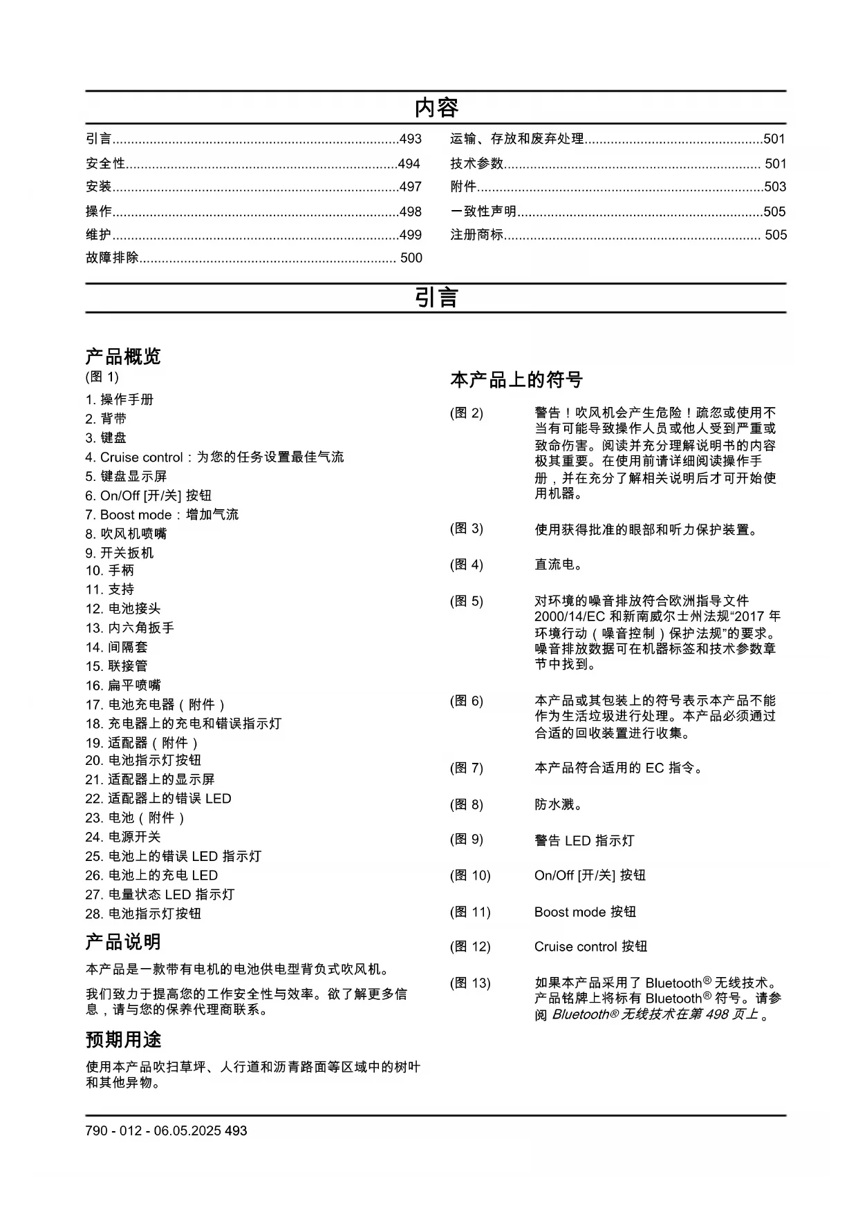 本产品是一款带有电机的电池供电型背负式吹风机。 我们致力于提高您的工作安全性与效率。欲了解更多信 息,请与您的保养代理商联系。