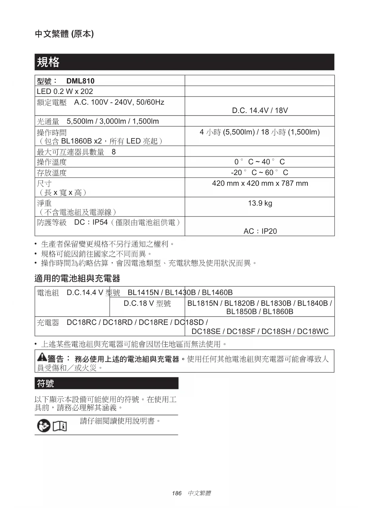 以下顯示本設備可能使用的符號。在使用工 具前,請務必理解其涵義。 請仔細閱讀使用說明書。187