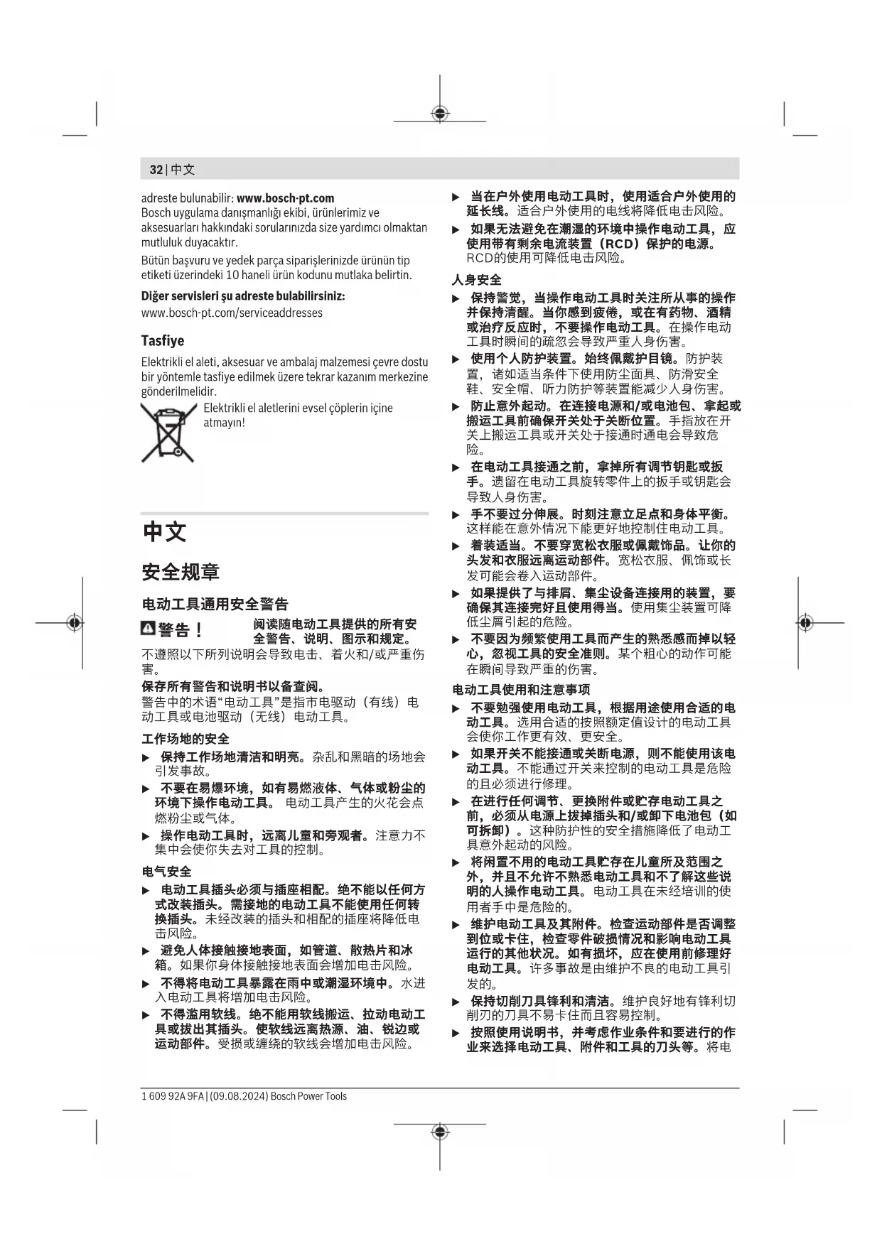 u 不要使用高速钢锯片。此类锯片容易折断。 Bosch Power Tools 1 609 92A 9FA | (09.08.2024)34 | 中文 u 不要锯切铁族金属。 带火星的切屑可能会点燃粉 u 请佩戴防尘面具。