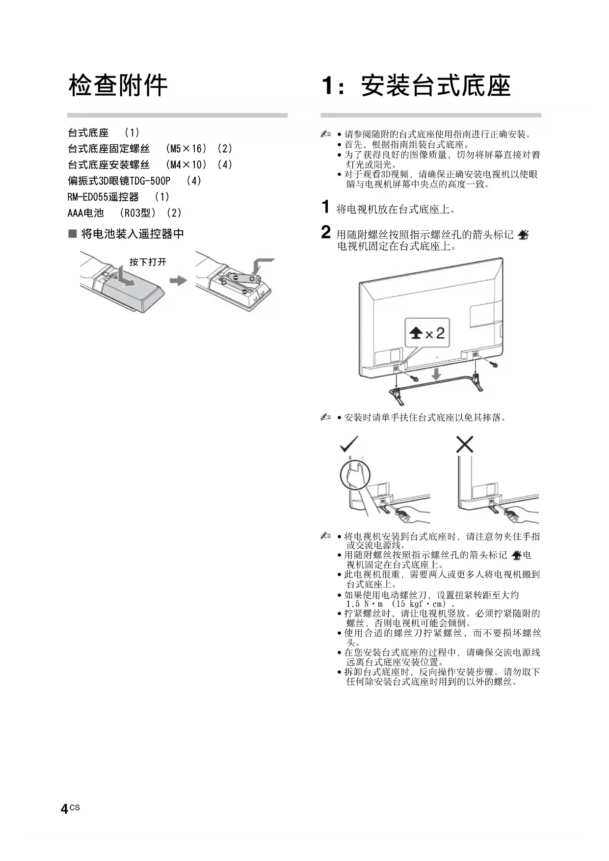 RM-ED055遥控器 (1) AAA电池 (R03型)(2) x 将电池装入遥控器中 1:安装台式底座 1 将电视机放在台式底座上。 2 用随附螺丝按照指示螺丝孔的箭头标记 将 电视机固定在台式底座上。