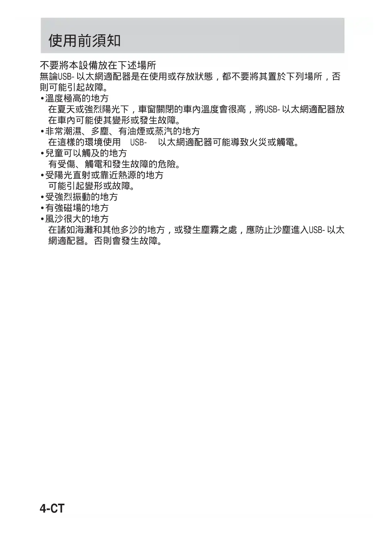 在諸如海灘和其他多沙的地方,或發生塵霧之處,應防止沙塵進入USB-以太 網適配器。否則會發生故障。5-CT