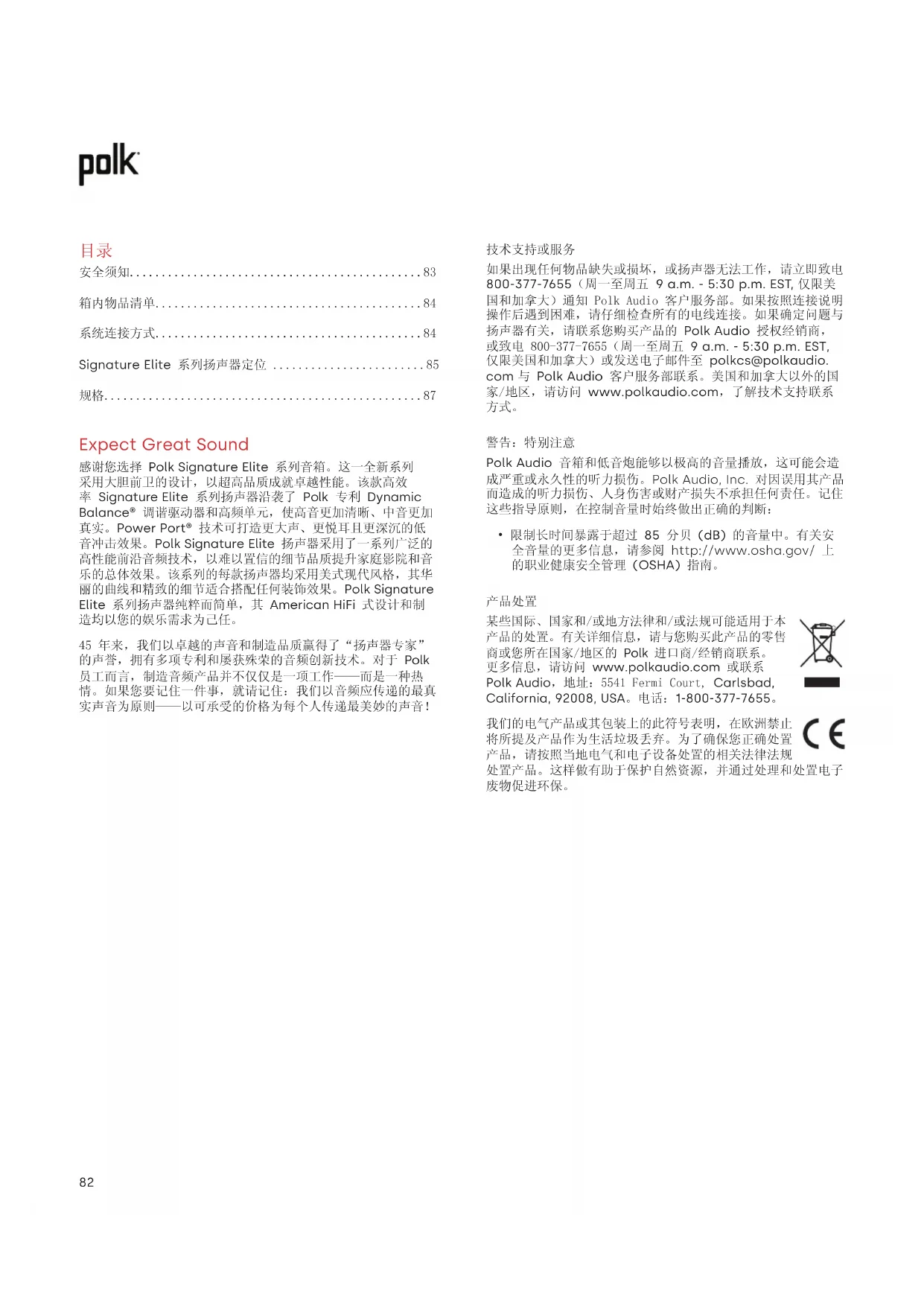 如果出现任何物品缺失或损坏,或扬声器无法工作,请立即致电 800-377-7655(周一至周五 9 a.m. - 5:30 p.m. EST, 仅限美 国和加拿大)通知 Polk Audio 客户服务部。如果按照连接说明 操作后遇到困难,请仔细检查所有的电线连接。如果确定问题与 扬声器有关,请联系您购买产品的 Polk Audio 授权经销商, 或致电 800-377-7655(周一至周五 9 a.m. - 5:30 p.m. EST, 仅限美国和加拿大)或发送电子邮件至 polkcs@polkaudio. com 与 Polk Audio 客户服务部联系。美国和加拿大以外的国 家/地区,请访问 www.polkaudio.com,了解技术支持联系