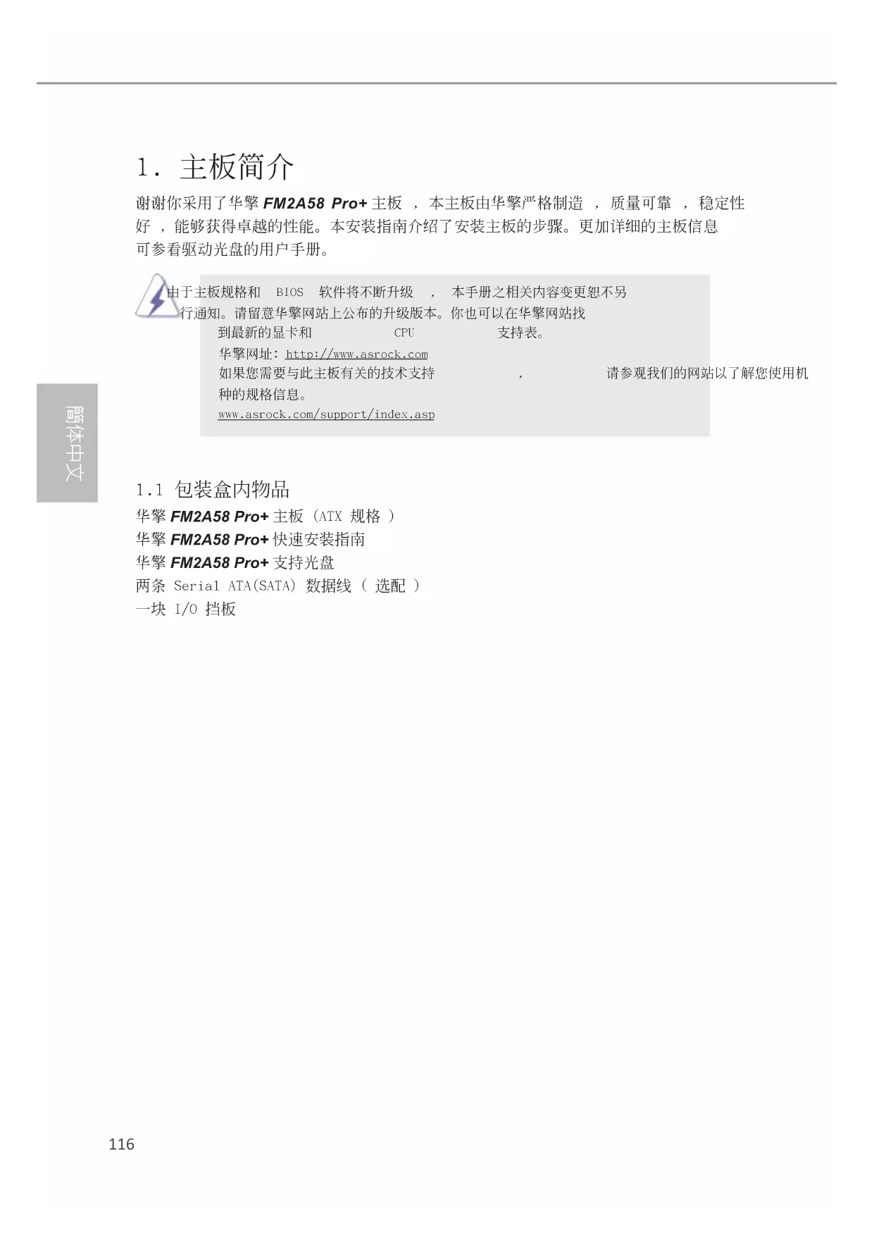 FM2A58 Pro+ 主板 , 本主板由華擎嚴格制造 , 質量可靠 , 穩定性 好 , 能夠獲得卓越的性能。本安裝指南介紹了安裝主板的步驟。更加詳細的主板信息 可參看驅動光盤的用戶手冊。 由于主板規格和 BIOS 軟件將不斷升級 , 本手冊之相關內容變更恕不另 行通知。請留意華擎网站上公布的升級版本。你也可以在華擎網站找 到最新的顯卡和 CPU 支持表。 華擎网址:http://www.asrock.com 如果您需要與此主板有關的技術支持 , 請參觀我們的網站以了解您使用機